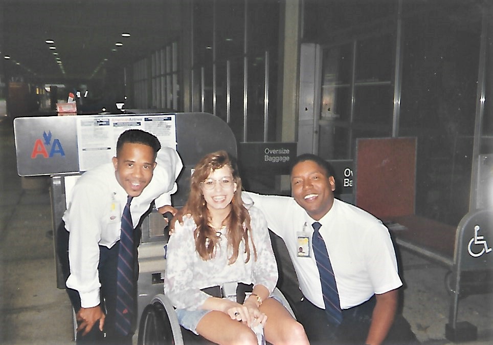 This was before 9/11 so my dad was able to stay with me even as I got to my seat and help me. I could stand and walk a few steps to get into my seat. This was not a huge plane so my dad took me out to the tarmac where we went on a lift so that I could board the plane. He helped me to get to my window seat and folded up my wheelchair so the stewardess could put it in the closet on the plane. Things would be so much different now. I loved it, and I was staring out the window the whole time! Their was a extremely overweight man sitting next to me so I was not able to see anything else even if I wanted to, lol! I remember him being very nice though! I was so in love with flying, and the people were so nice! I give American Airlines 2 thumbs up!!