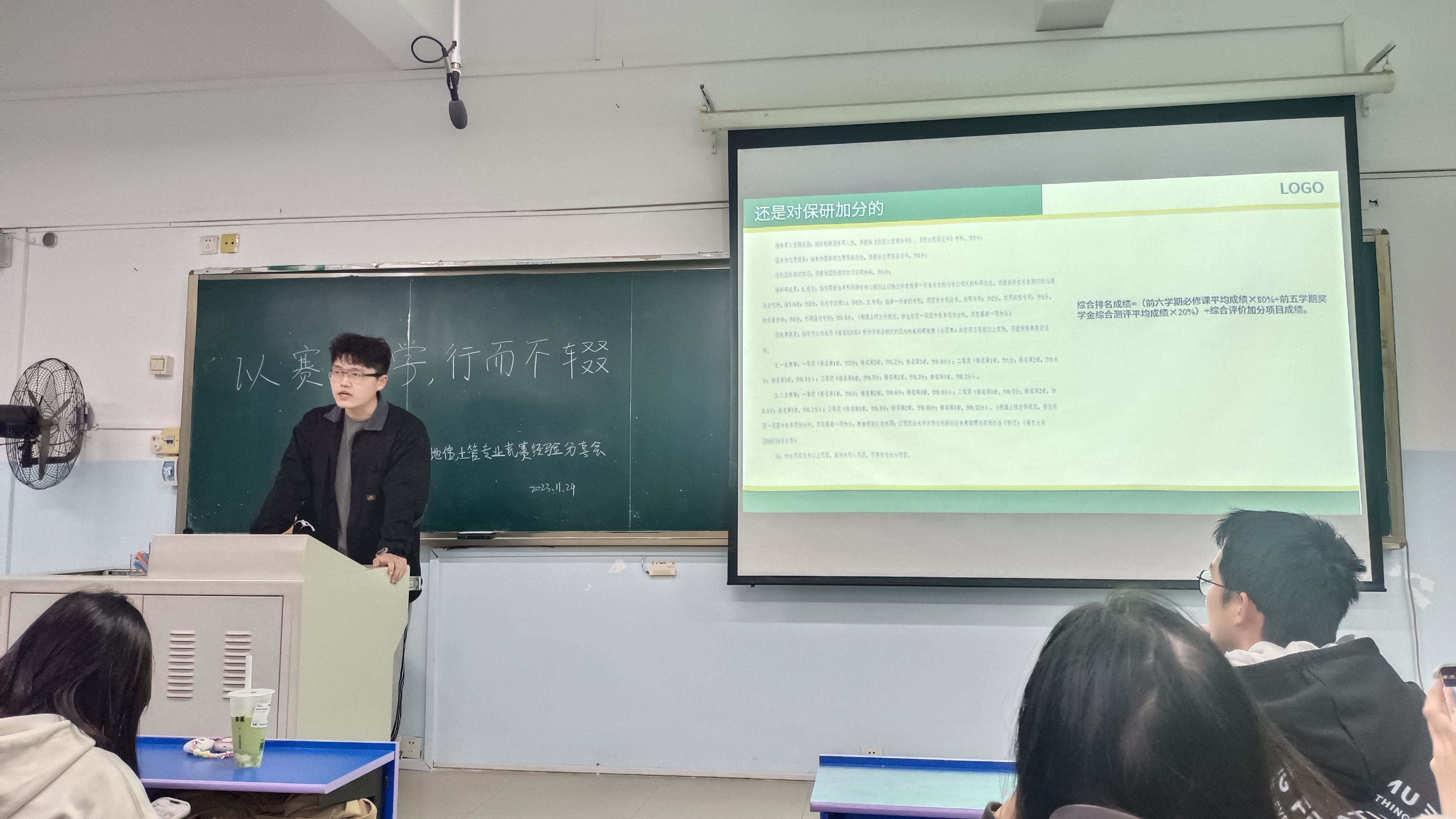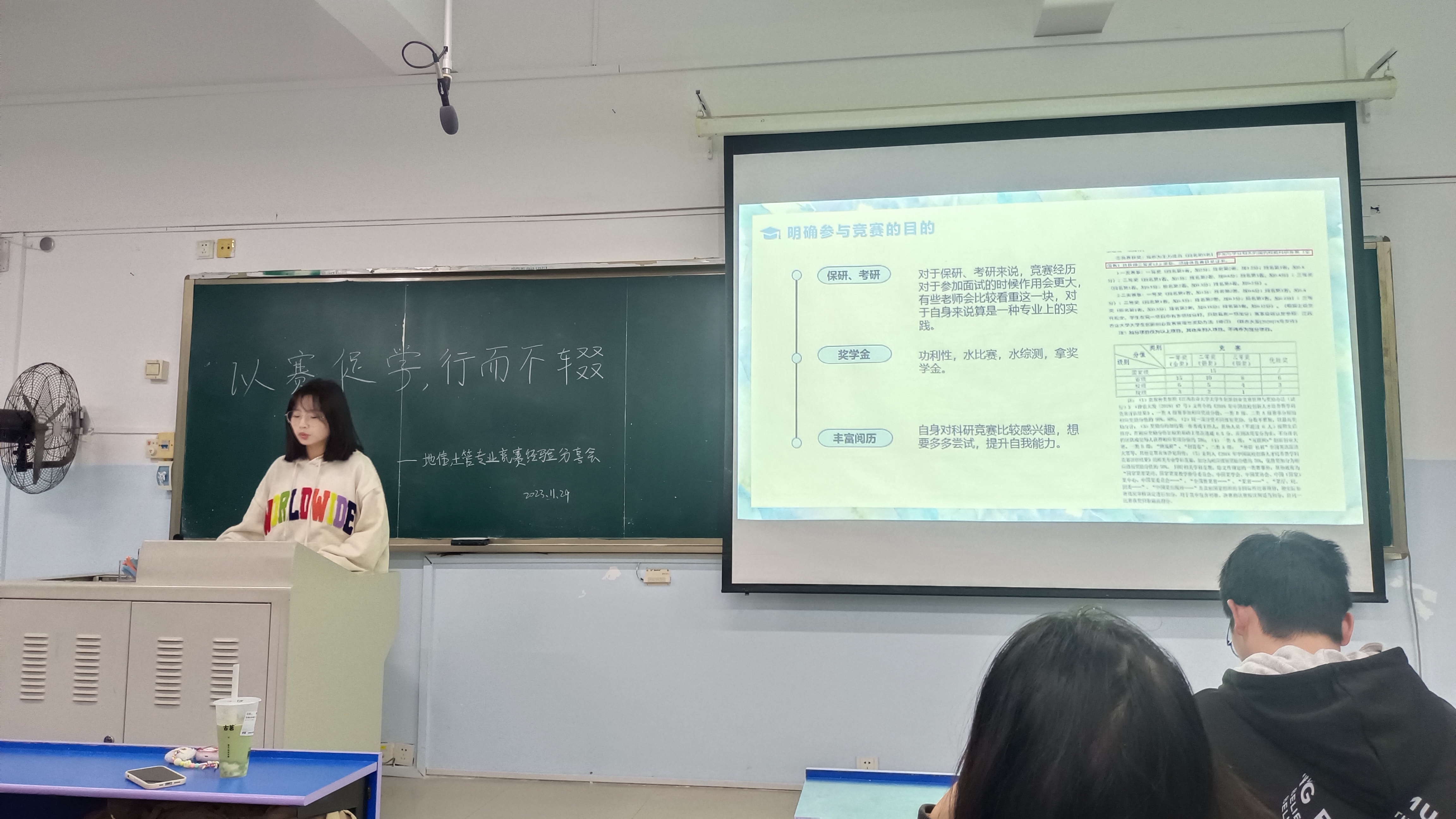 地信2001邵伊雯对地信专业的易智瑞杯中国老员工GIS软件开发以及一些国家级的比赛做了一个完整的介绍以及就比赛前准备和比赛中过程提出了一些建议,例如赛前可以先确定比赛主题,之后确定相应的思路,再做一些数据准备,在比赛时做好数据预处理,运用合理的方法以及编程代码或3D模型;地信2101毕晨铭则对比赛的整个过程阶段分享了自己的经验,以及比赛对于综测保研的加分的重要性;土管2101徐婧仪明确参与竞赛的目的,并分享了自己参加土地国情调查大赛时的亲身经历;土管2102黄文婷则介绍熟练的掌握办公软件,拥有强大的心理承受能力,随机应变的能力和组织协调能力等对比赛的重要性。土管2102林璟杰就各类学科比赛时间安排做了介绍,也分享了自己的参赛感悟。