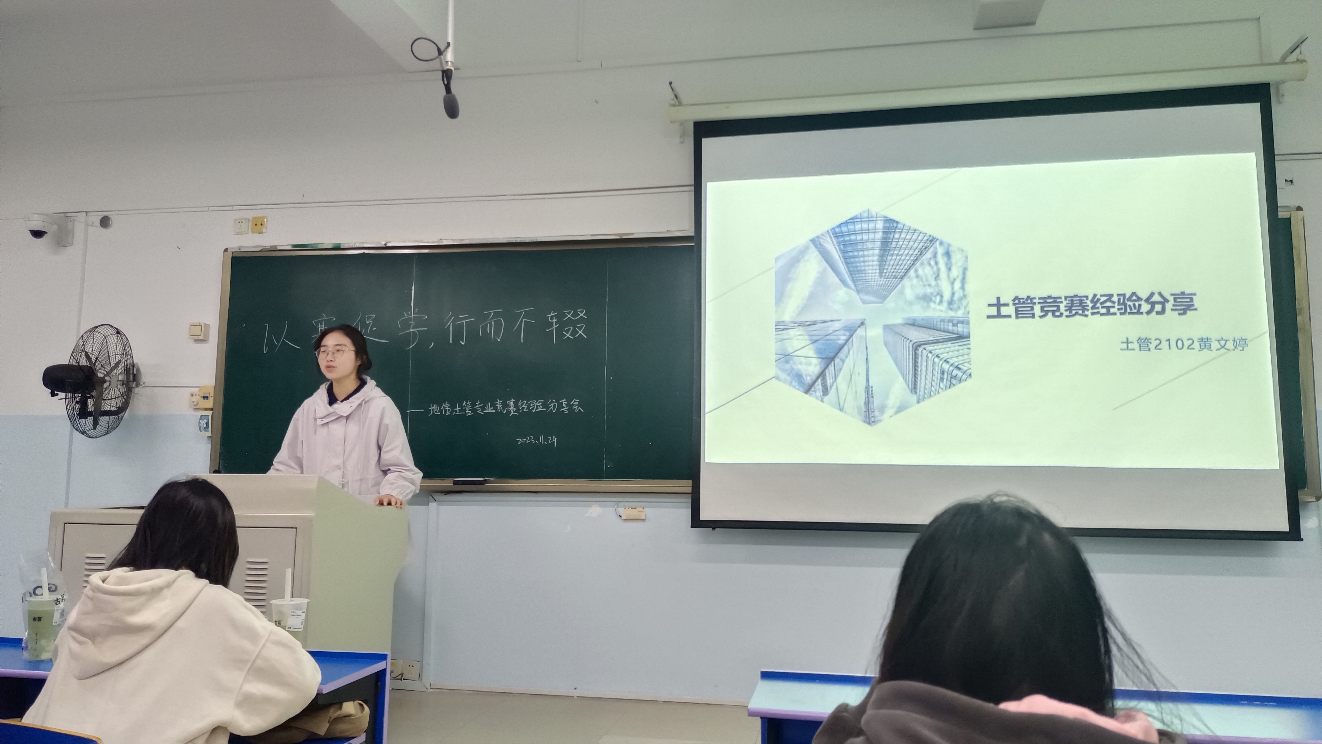 为更好地帮助22级土管系(土地资源管理、地理信息科学)专业的员工们对专业竞赛有更加深入了解,提升专业技能水平。11月29日晚,地信2201班联合土管2201,土管2202班,在五教325教室举行“以赛促学,行而不辍”竞赛经验交流会。活动邀请了地信2001邵伊雯,地信2101毕晨铭,土管2101徐婧仪,土管2102黄文婷,土管2102林璟杰五位学长学姐进行专业竞赛经验分享,地信2201班班主任王金亮老师以及22级地信,土管班级的全体同学参加分享会。