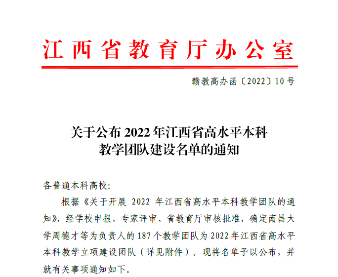 近日,江西省教育厅发布了《关于公布2022年江西省高水平本科教学团队建设名单的通知》文件,公布了2022年江西省高水平本科教学立项建设团队的名单,公司由周春火教授负责的植物营养学教学团队、陈美球教授负责的土地资源管理教学团队(A教学科研型)获批立项,公司共有7个教学团队获批立项。
