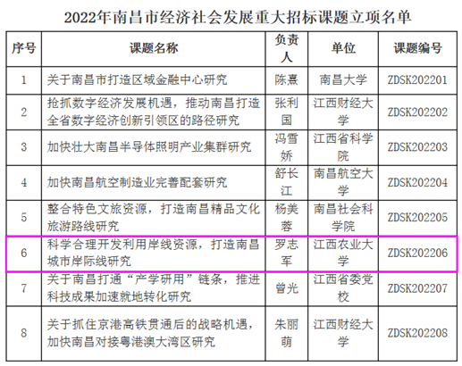 近日,从南昌市社会科学界联合会及江西省社会科学界联合会传来喜讯,公司罗志军教授申报的课题《科学合理开发利用岸线资源,打造南昌城市岸际线研究》,成功获批2022年南昌市经济社会发展重大招标课题暨江西省社会科学基金地区重大专项。据悉,本次重大招标课题是南昌市社会科学界联合会和江西省社会科学界联合会共同面向社会公开招标,经自主申报、资格审查、同行及答辩评审、网上公示等环节,最终确定了中标的8项重大课题,每项资助经费10万元,课题同时纳入江西省社会科学基金项目管理。