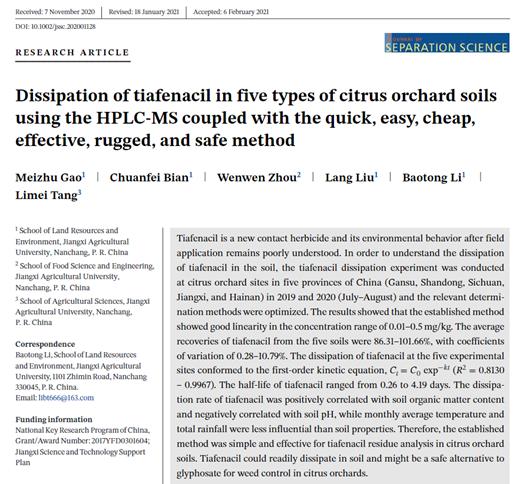 2021年2月6日,公司李保同老师课题组的2019级农业资源与环境研究生高美珠在《Journal of Separation Science》(SCI 2020 IF=2.878)上发表研究性论文1篇,主要为QuEChERS结合HPLC-MS方法测定Tiafenacil在五种土壤中的消解动态。