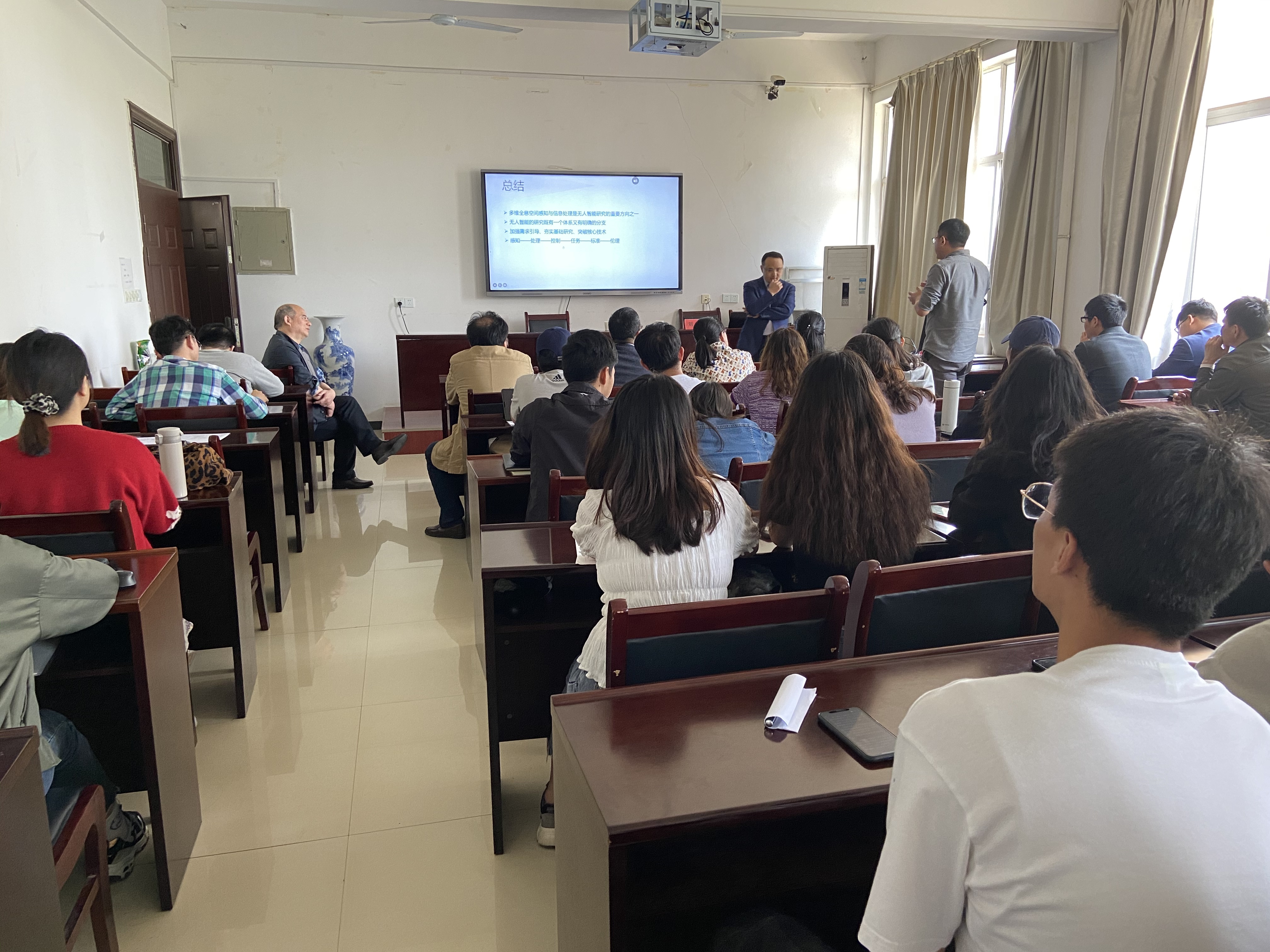 报告中,刘教授回顾了人工智能的发展历程,分析了其对测绘学科发展的影响,介绍了多传感器无人移动平台、视觉导航定位与无人智能、低空智能感知等方面的研究成果与应用。他还结合自己多年来求知探索的经历,提出科学研究要以现实需求为导向,夯实基础研究,突破核心技术,引领全产业链发展的观点。报告结束后现场师生与刘教授开展深入交流和讨论,与会师生纷纷表示收获丰富,深受启发和鼓舞。
