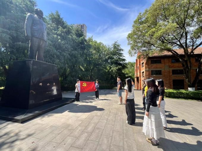活动中,刘志鑫老师带领本科生第一党支部的党员们,在邓小平同志的铜像下庄严重温入党誓词:“我志愿加入中国共产党,拥护党的纲领,遵守党的章程...”。