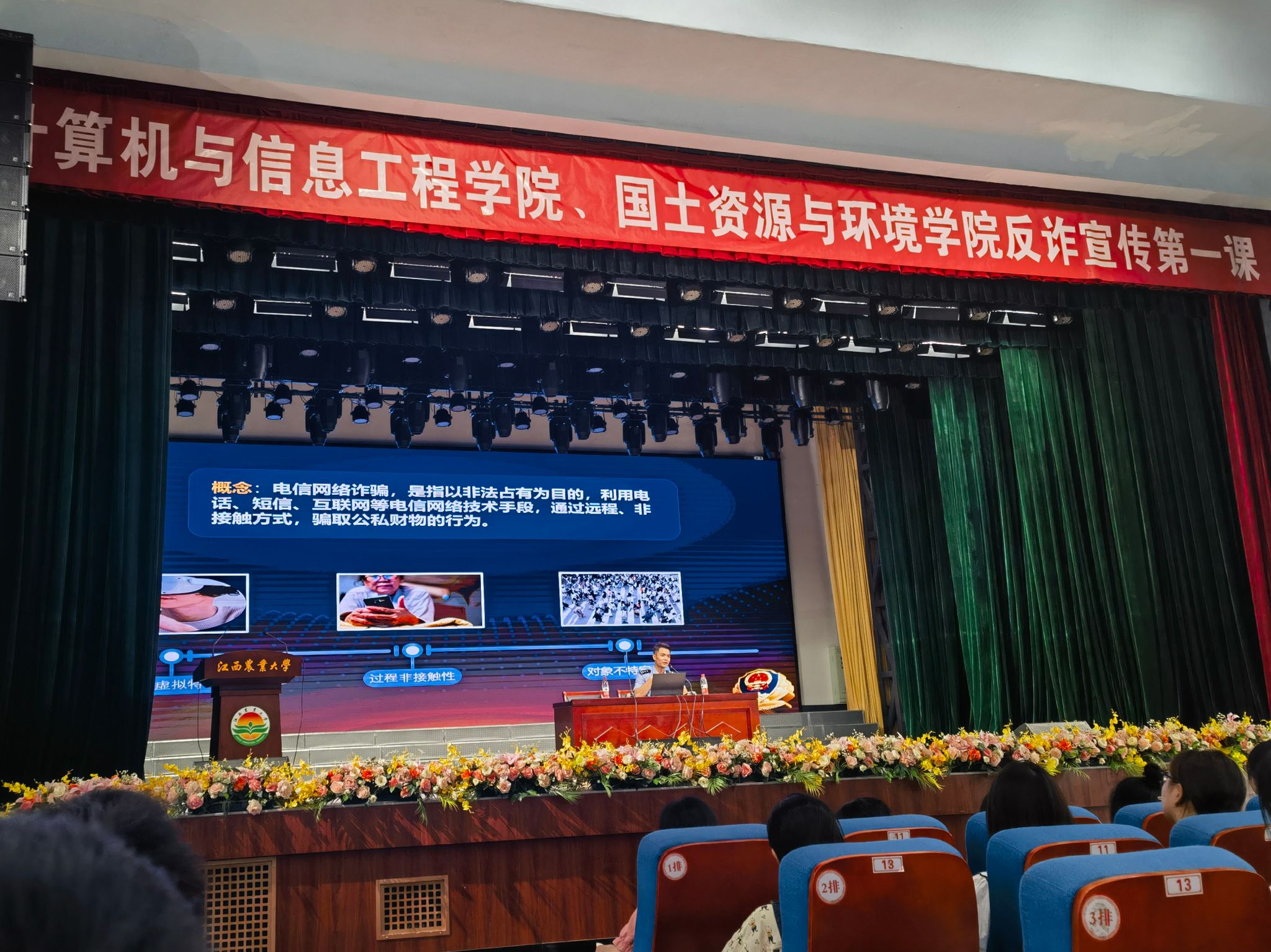 开展“安全教育”,把牢校园安全红线。为深化防范电信网络诈骗宣传教育工作,从源头上筑牢新生反诈意识,构建平安和谐校园环境,9月11日,学院开展新生反诈第一课,特邀请南昌市公安局反诈讲师团徐加明警官给2023级新生讲解反诈知识。通过以案说法的方式向在场同学们展现了常见的诈骗套路、手段以及如何应对的措施、方法,引导同学们做到“不听、不信、不转账”,筑牢反诈“防火墙”,守好自身“钱袋子”