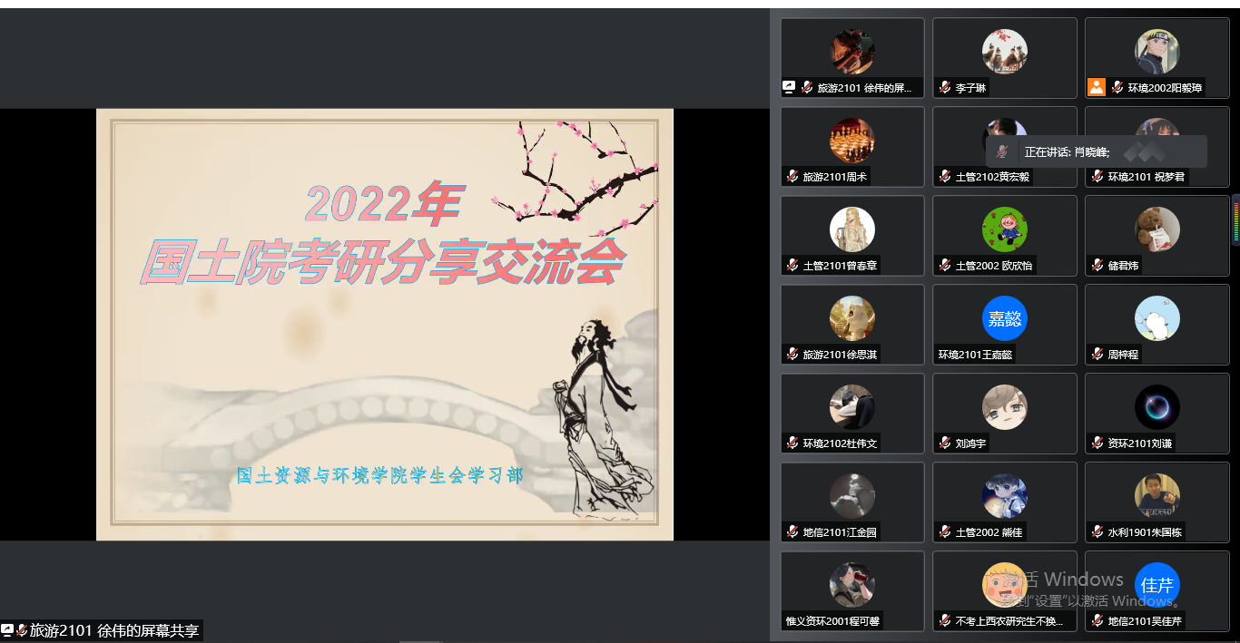 8名“准研究生”代表结合自身考研经验,就考研原因、院校选择,学习计划等方面做了详细的阐述。他们还从政治、英语以及专业课入手,进行了全面细致的剖析,讲解在学习过程中的方法与技巧。低年级学子就备考中存在的一些问题和疑惑积极进行提问和交流。线上会议室气氛热烈,取得了较好的效果。