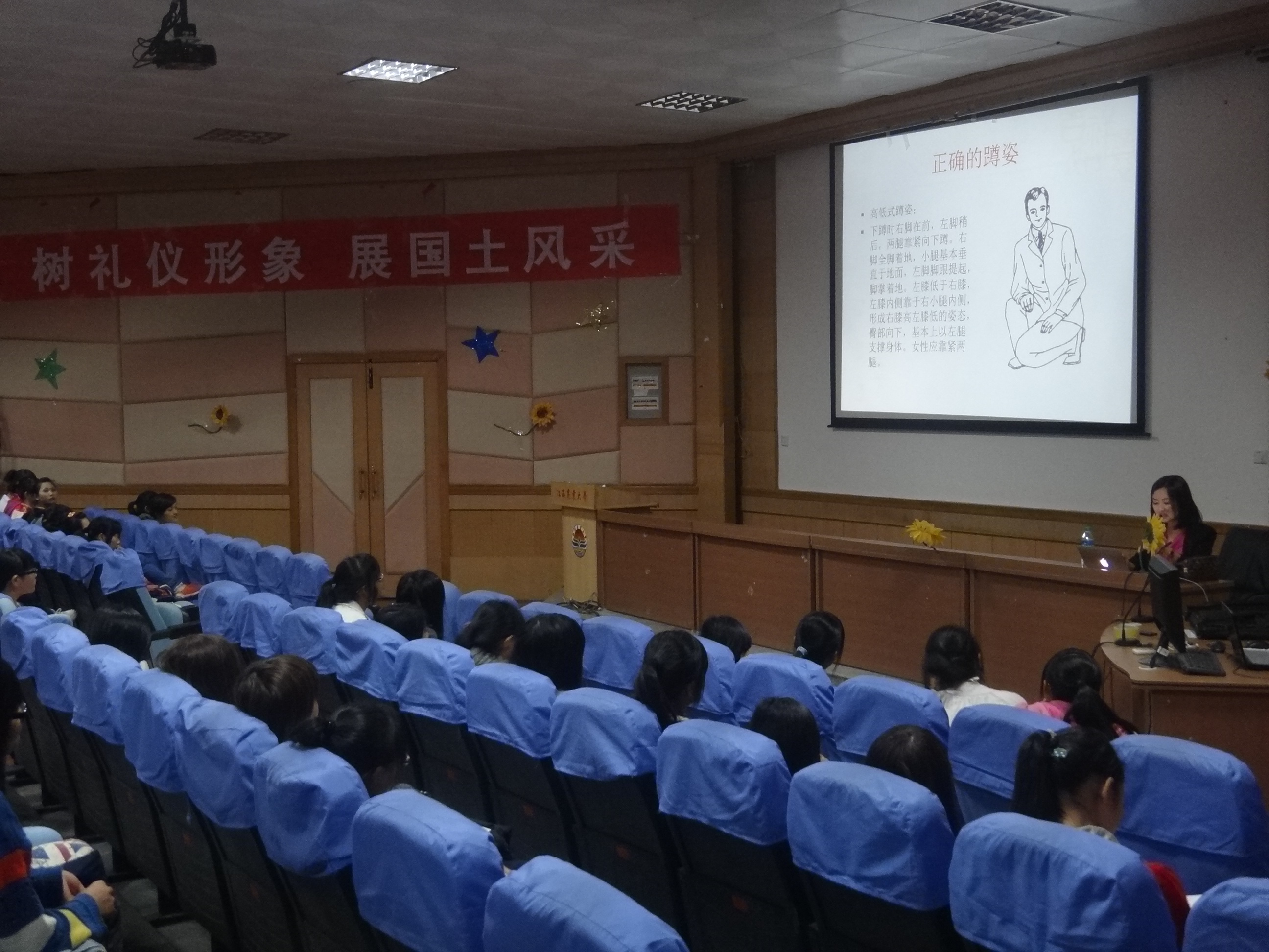 本报讯(李晶晶)10月23日晚七点,有公司团委员工会女生部开展的女性礼仪知识讲座获得圆满成功。主讲是公司旅游1101的班主任老师沈尧老师,此外,还有大一及大二年级的女生作为观众参与了本次讲座,全场共计约200余人。