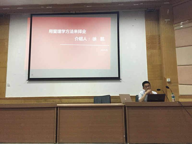 5月9日晚7点,在院科技馆报告厅,学院邀请到了2001级优秀员工、中国华皓控股集团济南建信置业有限公司总经理助理徐凯为学院2012级老员工做《用管理学方法来择业》的就业指导讲座,学工办程建华老师主持讲座。