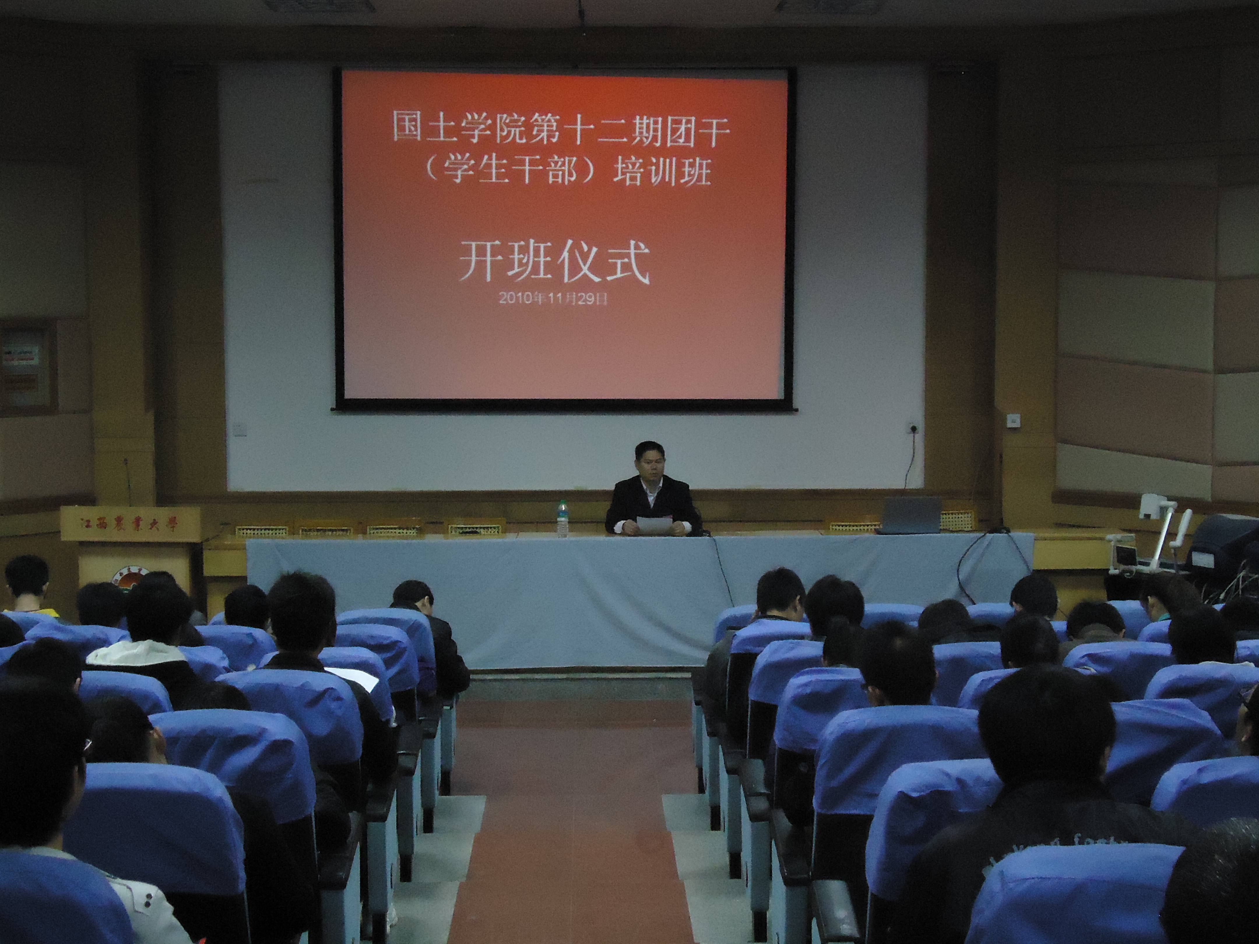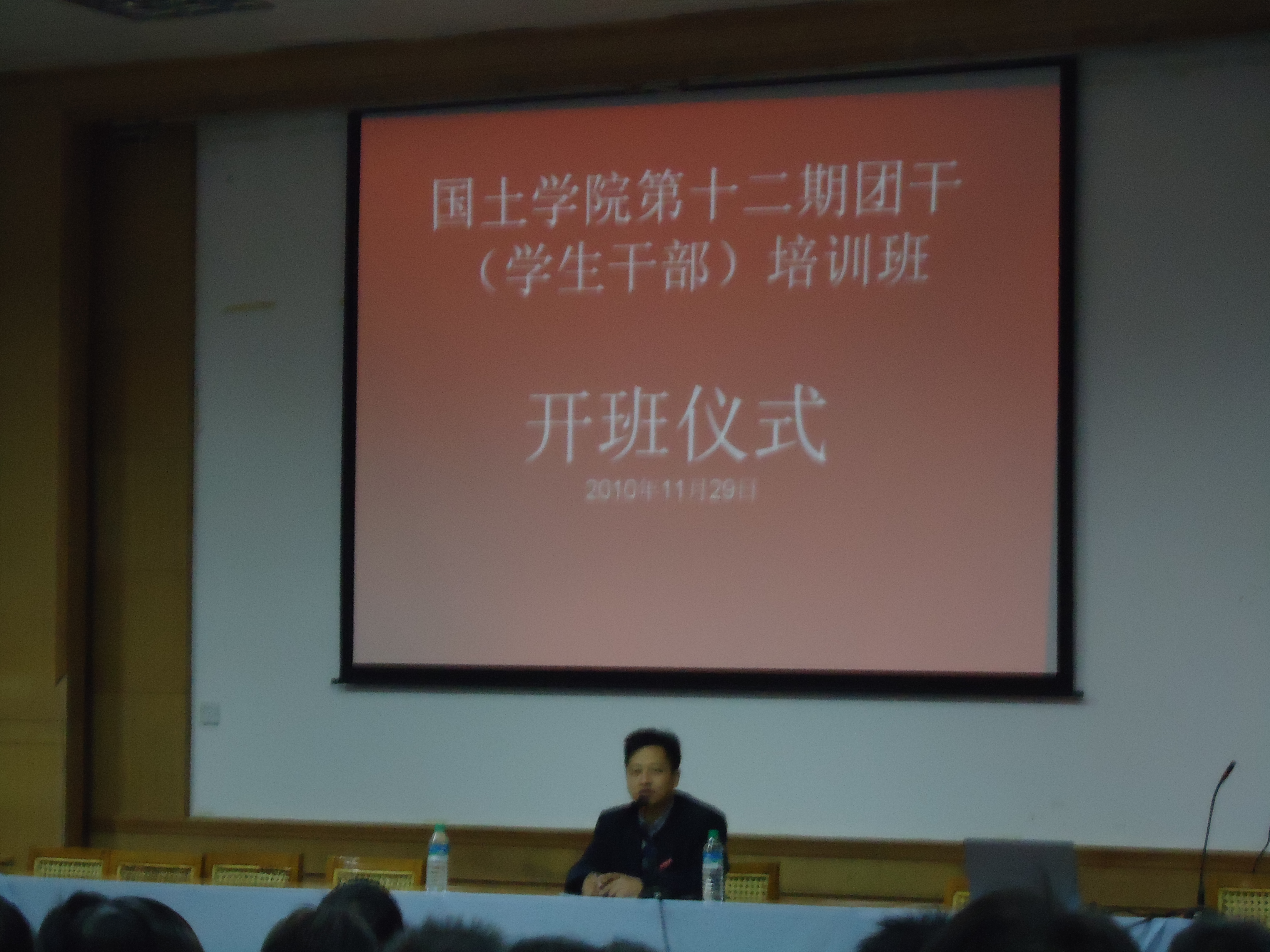 蔡海生副书记宣布开班仪式正式开始并发表讲话,蔡书记在讲话中对这次培训班的安排作了详细介绍,培训班由团委第二副书记王蛟龙担任班长,成员包括团学各部门副部和干事以及各班班委。本次培训班由11月29日至12月3日为期5天,前四天分别由杨欢书记,郭旭书记, 经贸公司党委副书记刘庆言,蔡海生书记依次讲课,最后一天为学习总结讨论会。蔡书记提出本次培训班的目的主要在于提高团干(员工干部)的素质和能力,更好地服务同学。