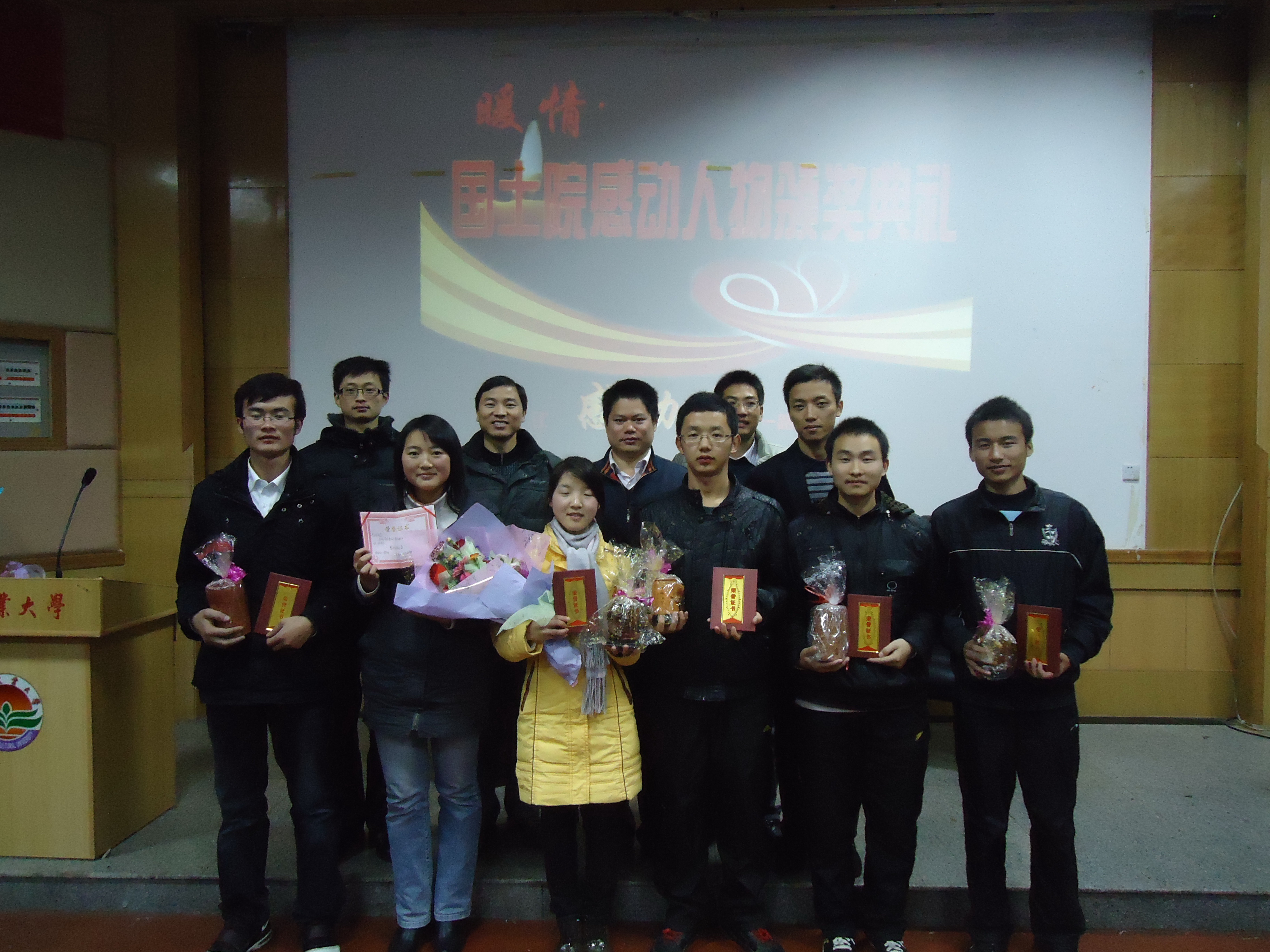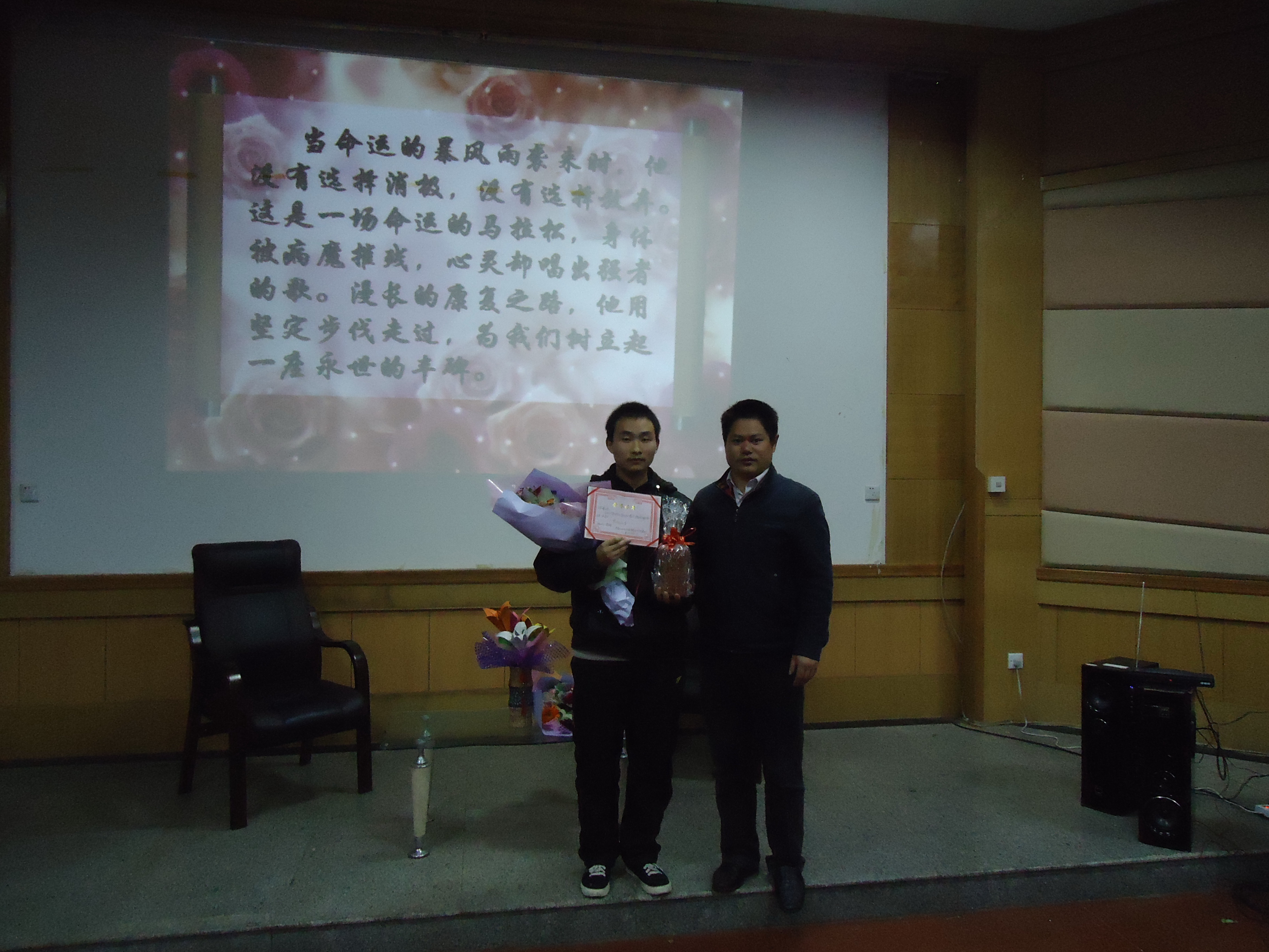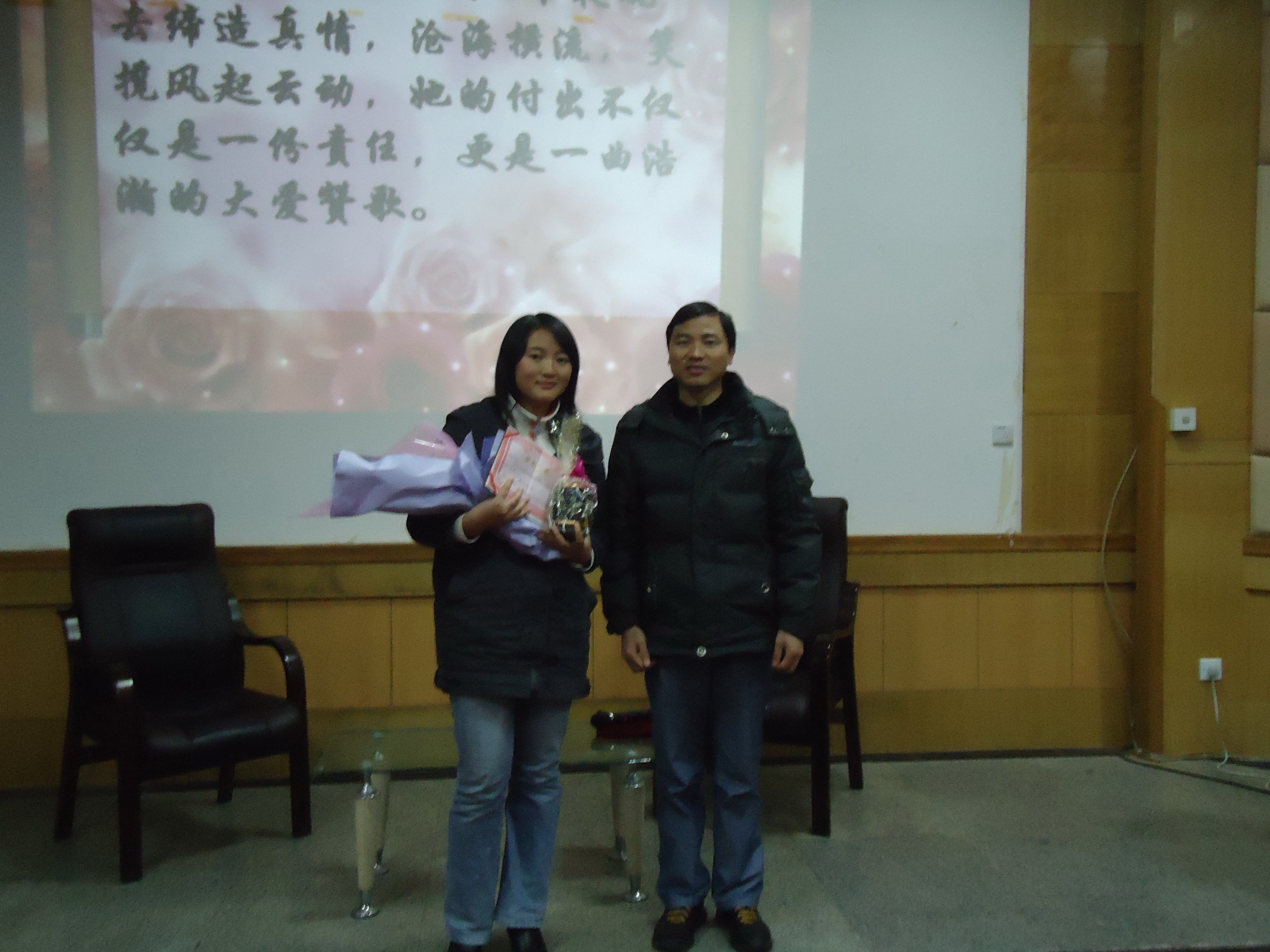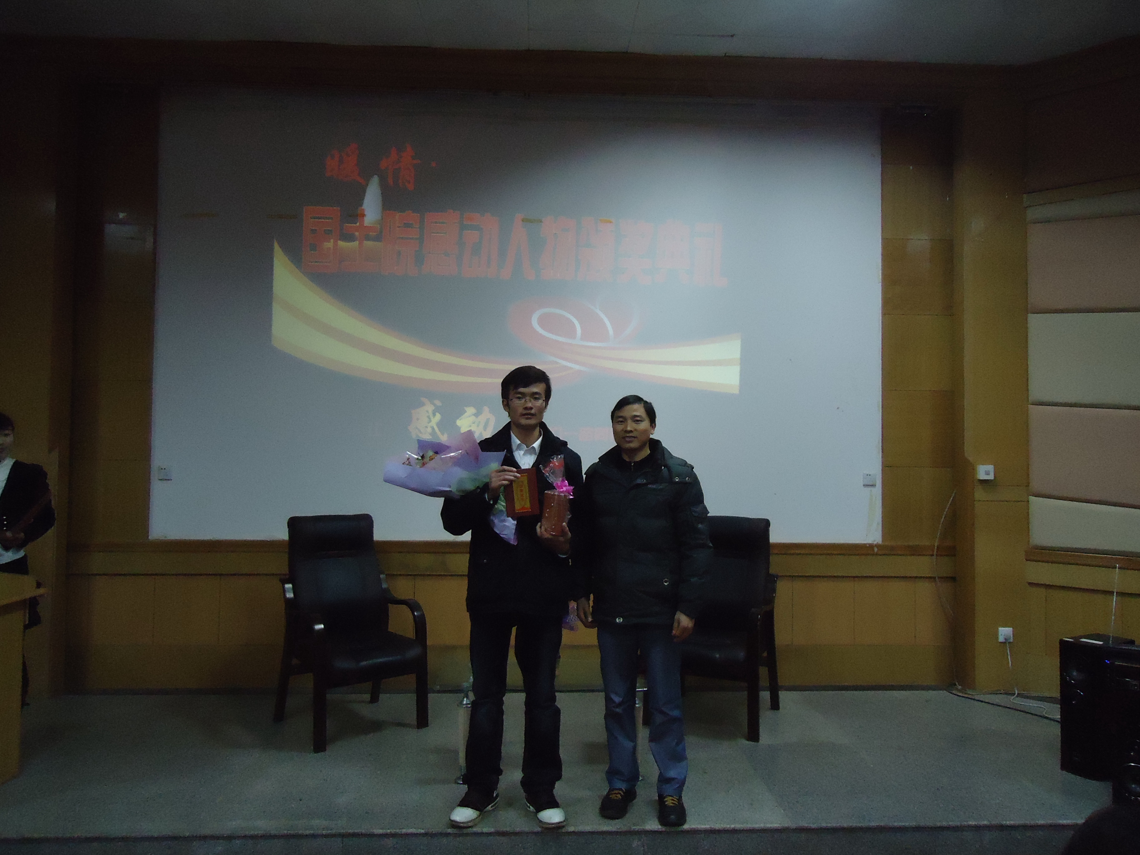 一首广为传唱的歌曲《感恩之心》和感动人心的幻灯片拉开了本次颁奖典礼的帷幕。本次颁奖典礼分为三个部分:第一部分是由主持人对每位同学的感动事迹进行一一解说,第二部分是员工会主席张小清对他们的感动事迹进行面对面专访并播放同学老师对获奖选手评价的视频。第三部分则是国土公司党委副书记蔡海生和团委副书记郭细根为他们颁奖。本次感动之星共有6位同学,大一一名,大二两名,大三三名,他们分别是志愿奉献,青春无悔的旅游091班房董祥同学,“百善孝为先”学习努力,乐于助人的旅游101班徐继林同学,真心奉献,为班级和社团工作到深夜的旅游081班李秋兰同学,一个身单力薄,用笑容面对生活的环工081班徐敏同学,自强不息,关爱身边每一个人有需要的人的土管081班王忠祥同学和抗震救灾,逆境中坚强成才的土管092班张佳佳同学。他们乐于奉献,充满爱心的精神深深打动了在场的每一位同学,赢得了同学们热烈的掌声。他们一句句简单朴实的言语却道出了这个世界的一片真情和爱。