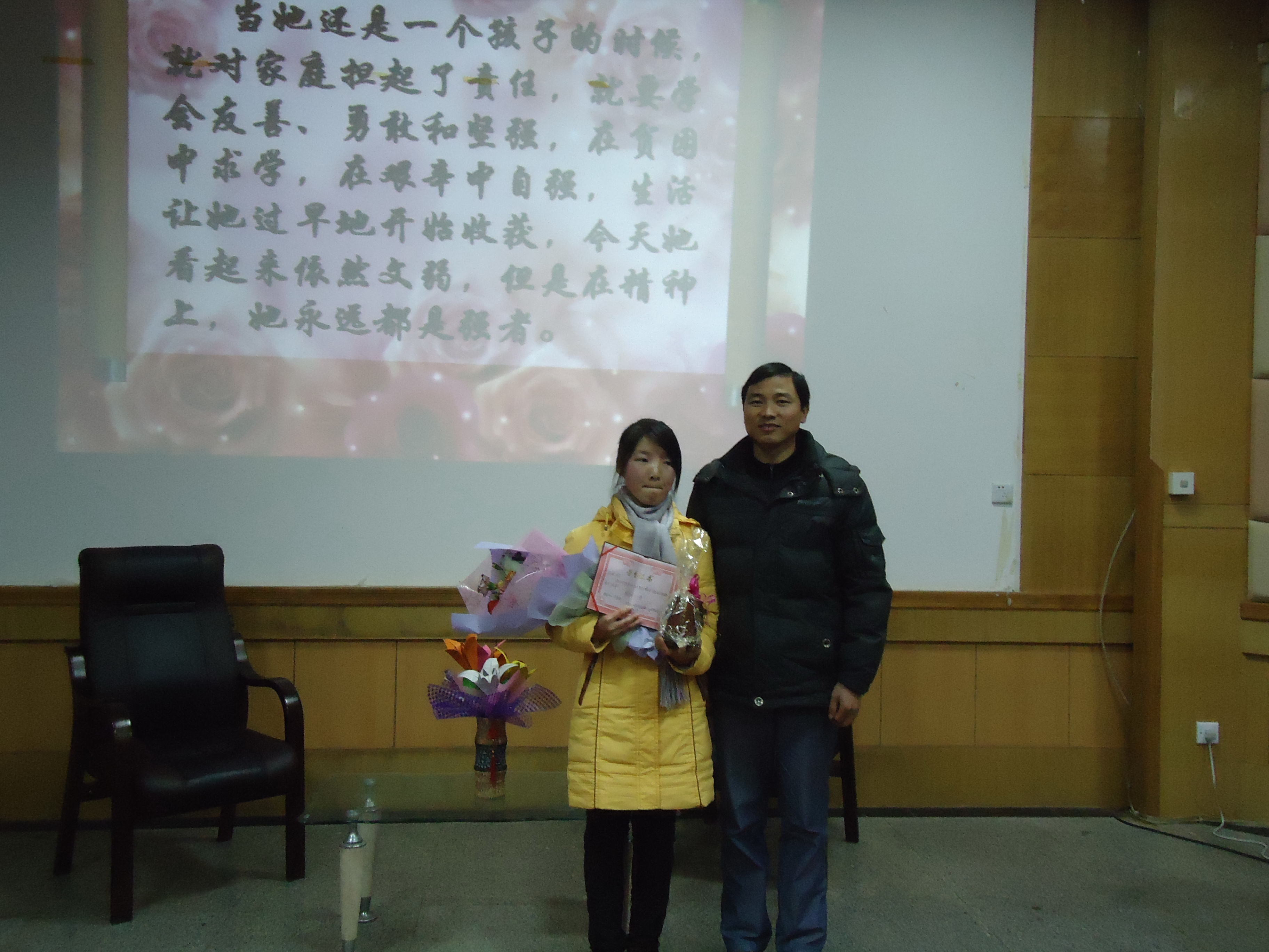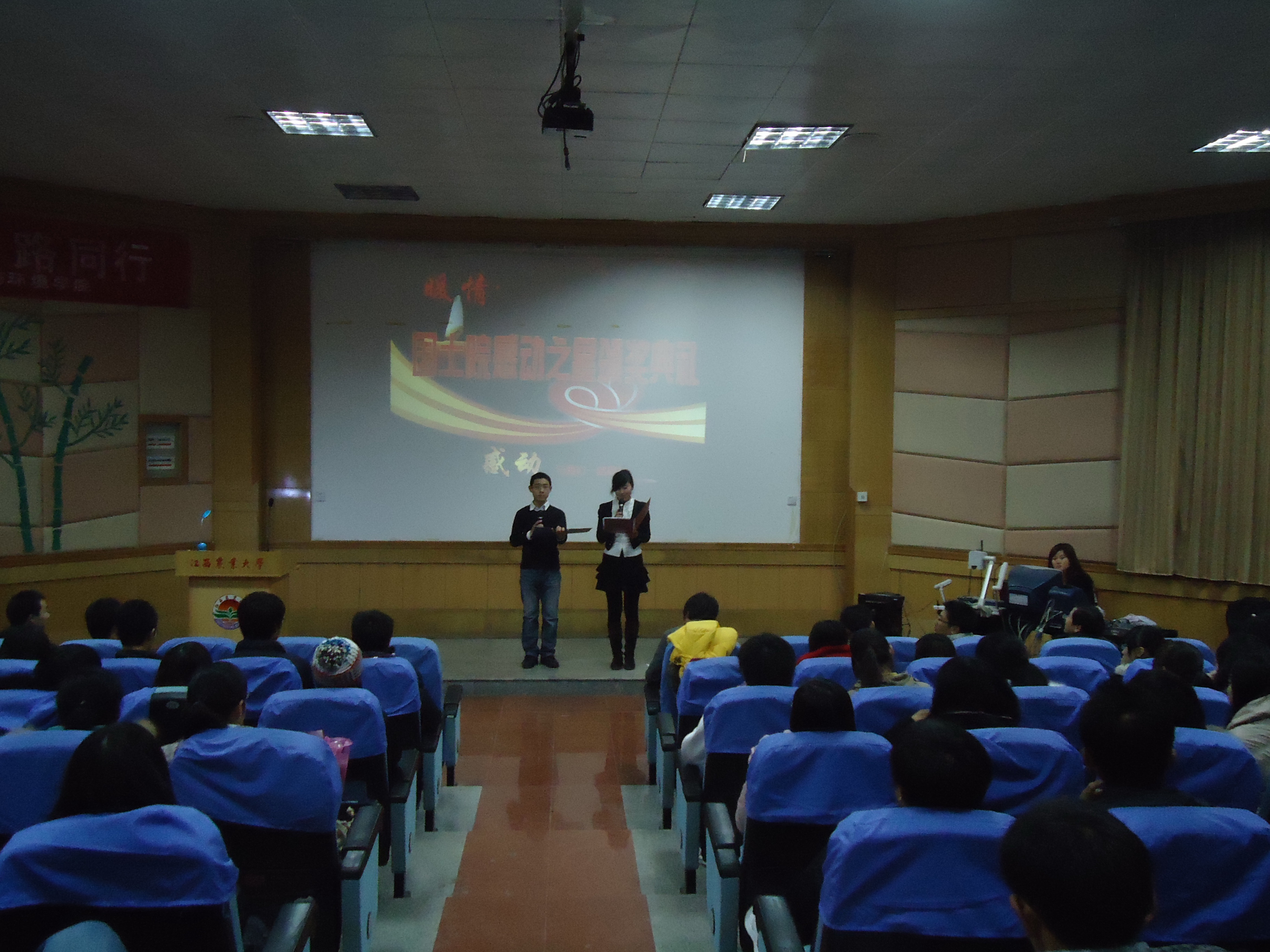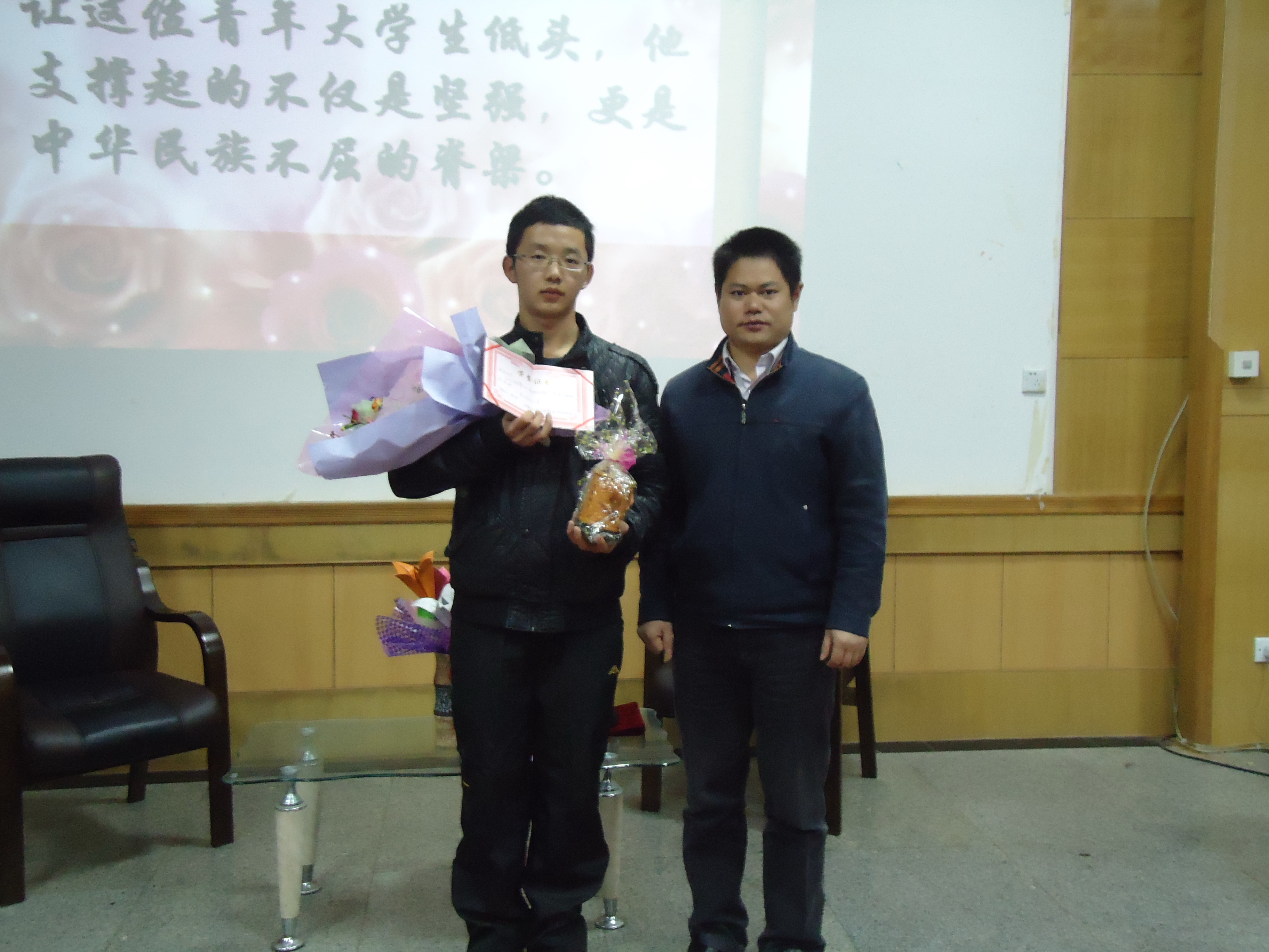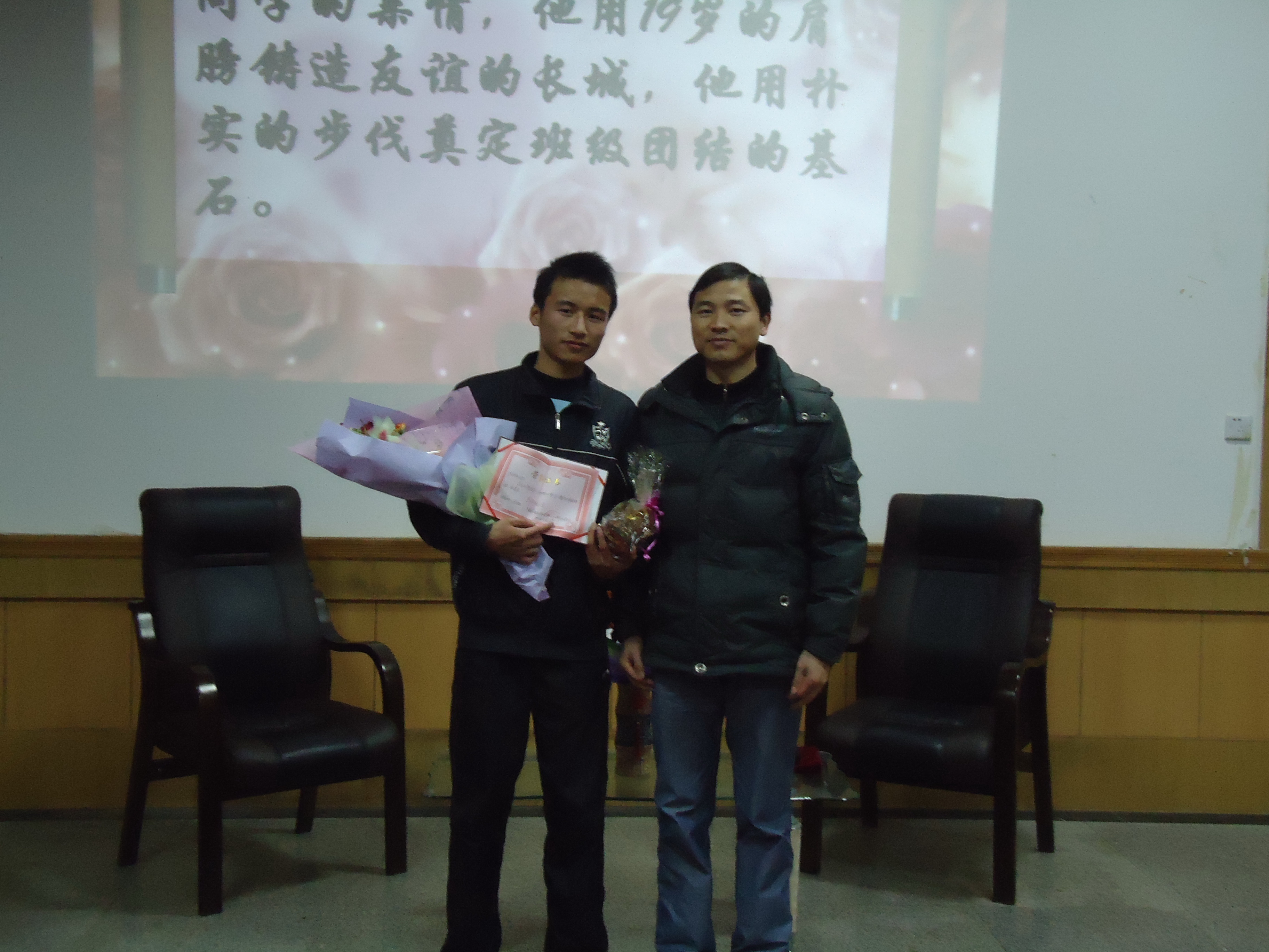 一首广为传唱的歌曲《感恩之心》和感动人心的幻灯片拉开了本次颁奖典礼的帷幕。本次颁奖典礼分为三个部分:第一部分是由主持人对每位同学的感动事迹进行一一解说,第二部分是员工会主席张小清对他们的感动事迹进行面对面专访并播放同学老师对获奖选手评价的视频。第三部分则是国土公司党委副书记蔡海生和团委副书记郭细根为他们颁奖。本次感动之星共有6位同学,大一一名,大二两名,大三三名,他们分别是志愿奉献,青春无悔的旅游091班房董祥同学,“百善孝为先”学习努力,乐于助人的旅游101班徐继林同学,真心奉献,为班级和社团工作到深夜的旅游081班李秋兰同学,一个身单力薄,用笑容面对生活的环工081班徐敏同学,自强不息,关爱身边每一个人有需要的人的土管081班王忠祥同学和抗震救灾,逆境中坚强成才的土管092班张佳佳同学。他们乐于奉献,充满爱心的精神深深打动了在场的每一位同学,赢得了同学们热烈的掌声。他们一句句简单朴实的言语却道出了这个世界的一片真情和爱。