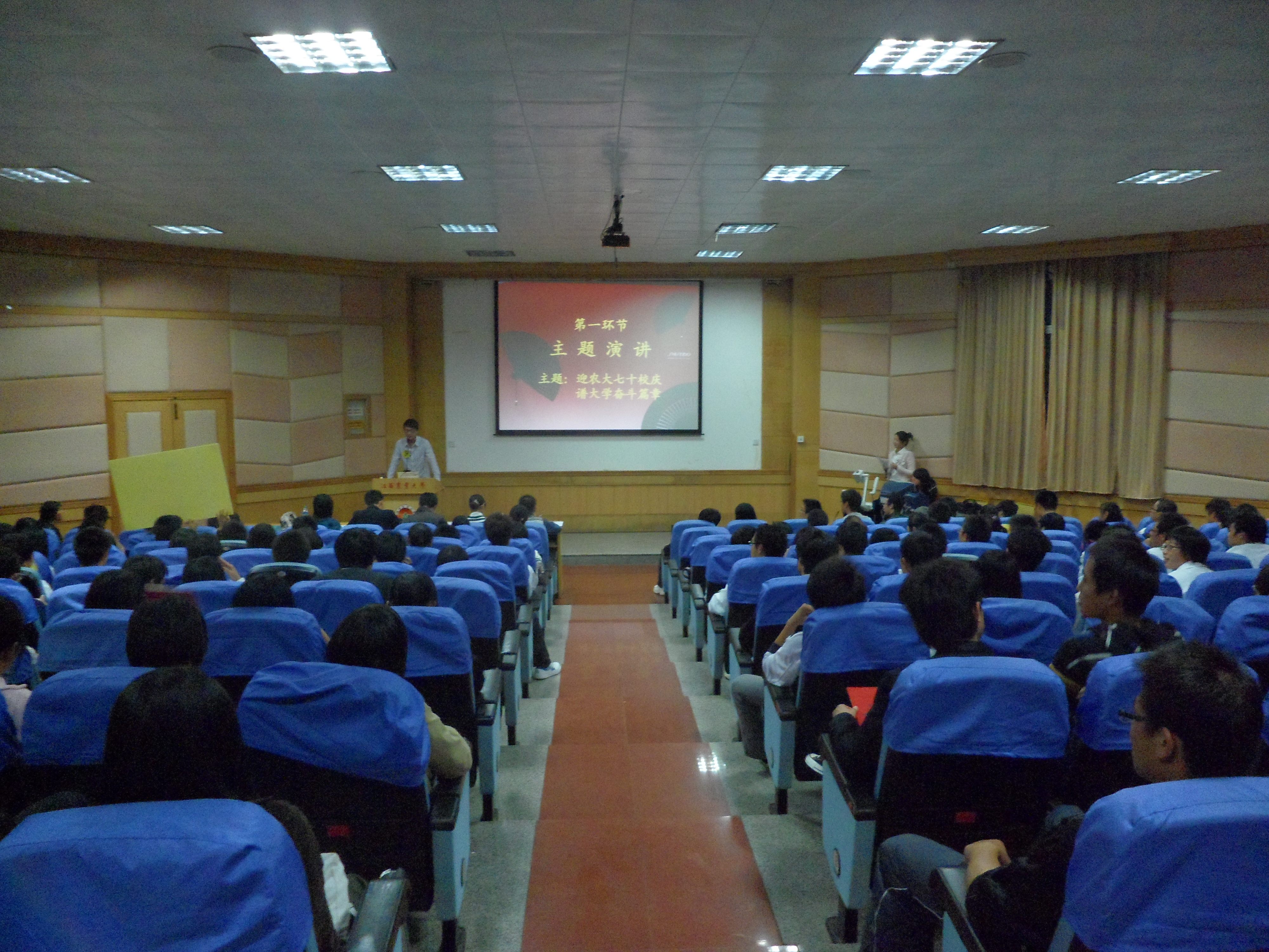 决赛于10月23日晚七点在科技馆报告厅举行。决赛由公司路阔同学担任主持人,并邀请了理学院团学副书记张辉,校记者团团长陈龙川,校广播站播音孙会岩,人文院辩论组负责人张力喻以及公司09级新生演讲赛冠军张丽君担任评委。决赛分主题演讲和即兴演讲两个部分。决赛现场,选手们各个都使出了自己的绝活,一个个精彩的演讲赢得了场下观众的阵阵掌声。尤其是侯耀辉同学,他精彩的演讲,慷慨激昂的说辞给现场的评委和同学都留下了深刻的印象。而卫倩茹同学灵活的现场表现和她良好的台风更是将现场气氛推至最高潮。而在主题演讲之后,公司09届新生演讲比赛冠军张丽君同学也做了精彩的表演,表达了自己对农大七十年校庆的感受。比赛最后,评委张辉同学对每一位选手的表现一一做出了详细精彩的点评,而后学工办谭会乐老师首先对本次新生演讲大赛的成功举办表示肯定,同时赞赏了各位参赛选手的精彩表现并对他们提出了更高的期待。