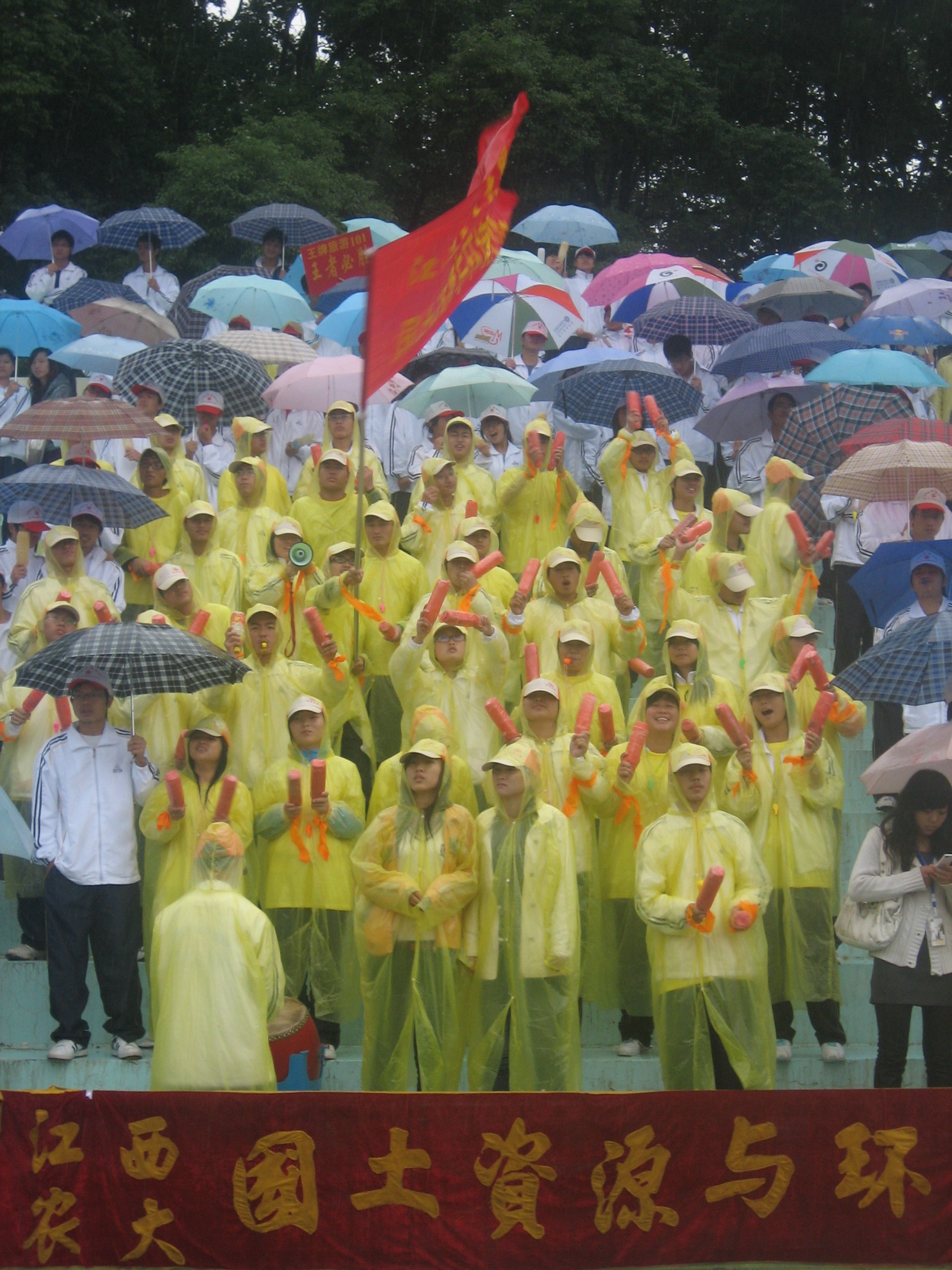 公司啦啦队队员们冒雨为运动员加油——激情澎湃