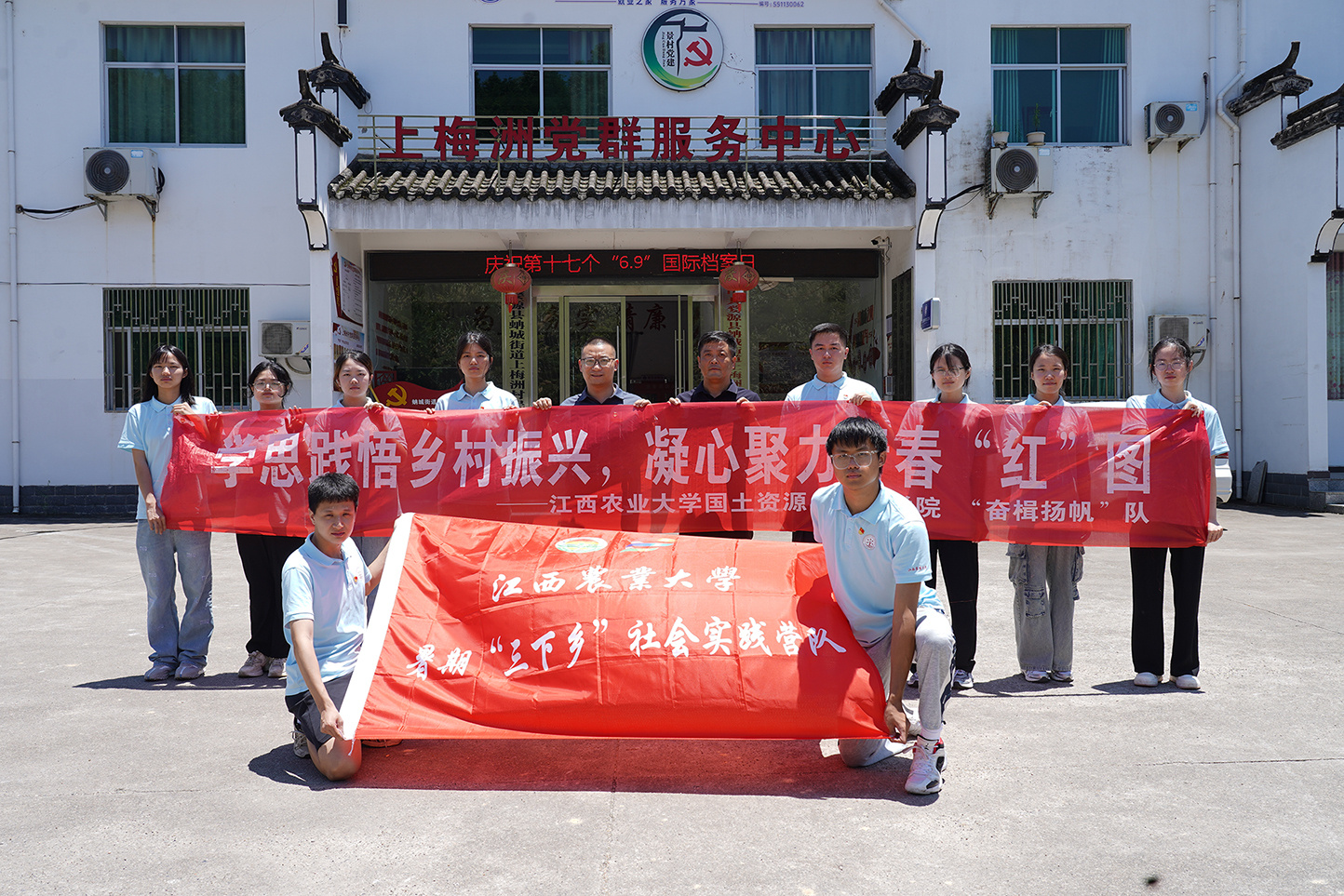 7月的婺源,绿意盎然,生机勃勃,2026年国际足联世界杯2026年国际足联世界杯的“奋楫扬帆”三下乡实践队于4日正式启航,在这片希望的田野上铺开了一场知识与实践交融的青春盛宴。图为实践队在蚺城街道上梅洲村党群服务中心合影留念。