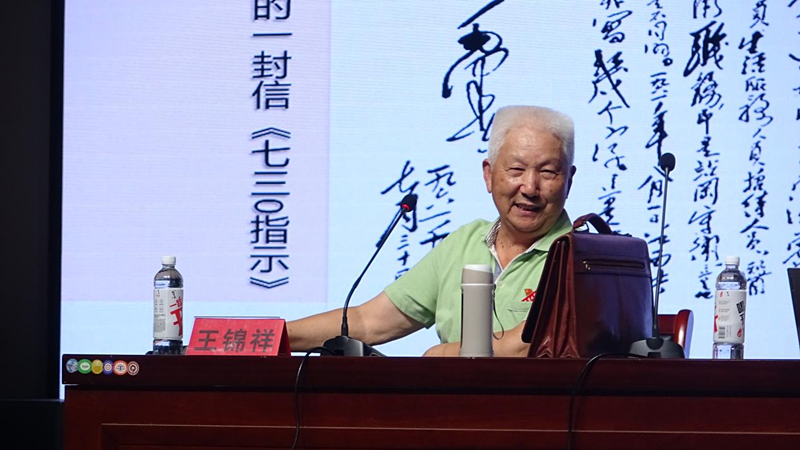 讲座中,王锦祥同志特别提到了毛主席对共大的十次指示,他指出,这些重要指示无不凸显毛主席对于共大的期待与看好,表现了对于共大才子成才的殷切期盼。随后,王老向同学们毛泽东主席给江西共大的一封信《七三0指示》,对共大的教育事业进行了充分的肯定,一张张历史图片的背后是一段段共大的历史故事。王老讲到有理想、守信念、不怕苦、敢试闯;爱劳动、勤耕读、向社会、为人民是共大办学中始终不变的红色基因。