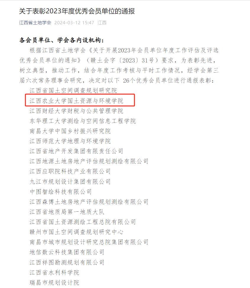 3月12日,从江西省土地学会获悉学院获得江西省土地学会2023年度优秀会员单位表彰。