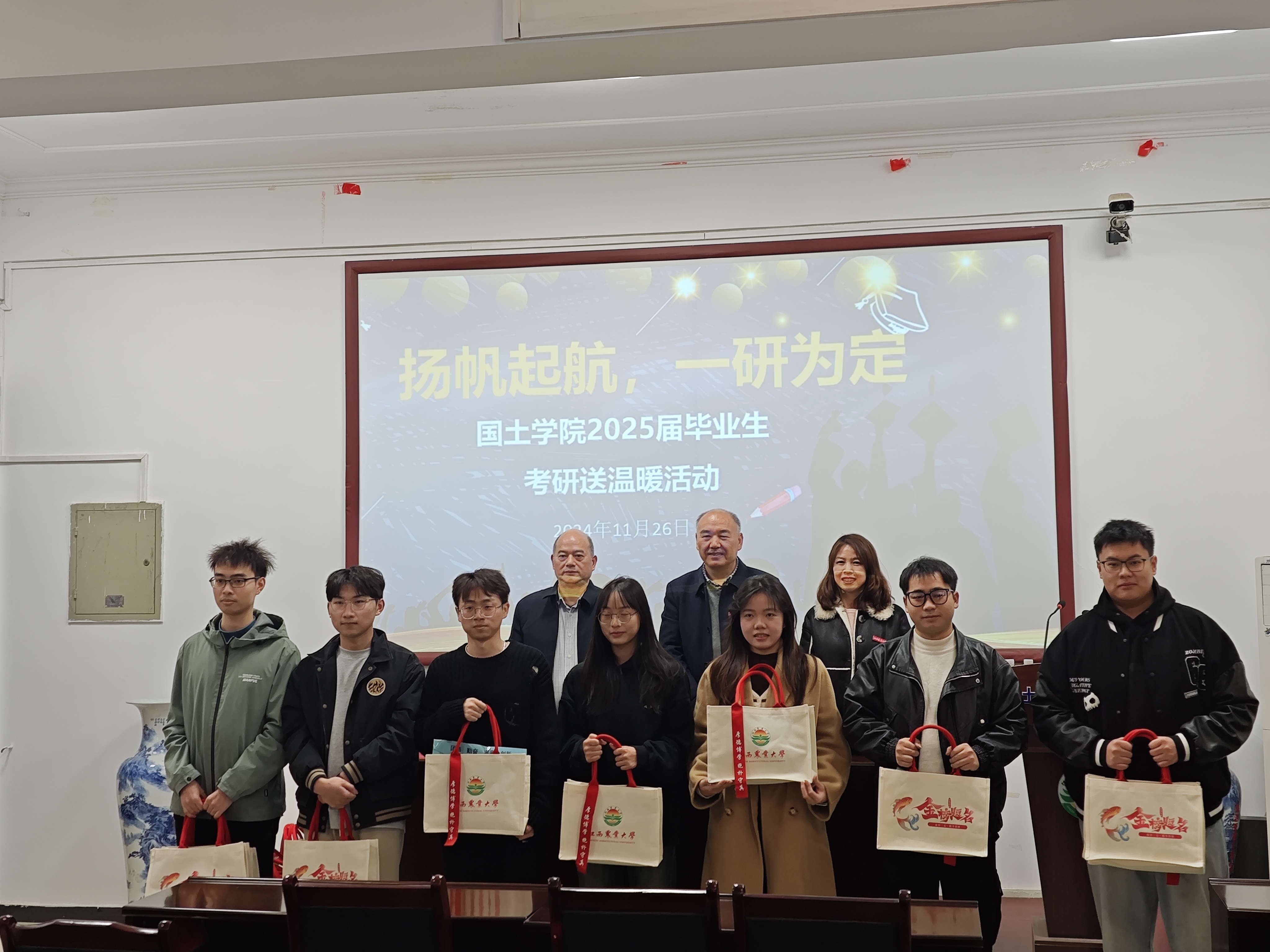 员工代表感谢学院一直以来的辛勤付出和对考研学子的关爱,并表示会在最后的冲刺阶段奋力拼搏,拿出自己最好的状态,以最优异的成绩回报学院,回报学校。最后,全体领导老师为毕业生送上暖心大礼包:考试文具、咖啡、暖宝宝、蒸汽眼罩等,寓意着对考研学子们“一‘研’为定”的祝福与期待。