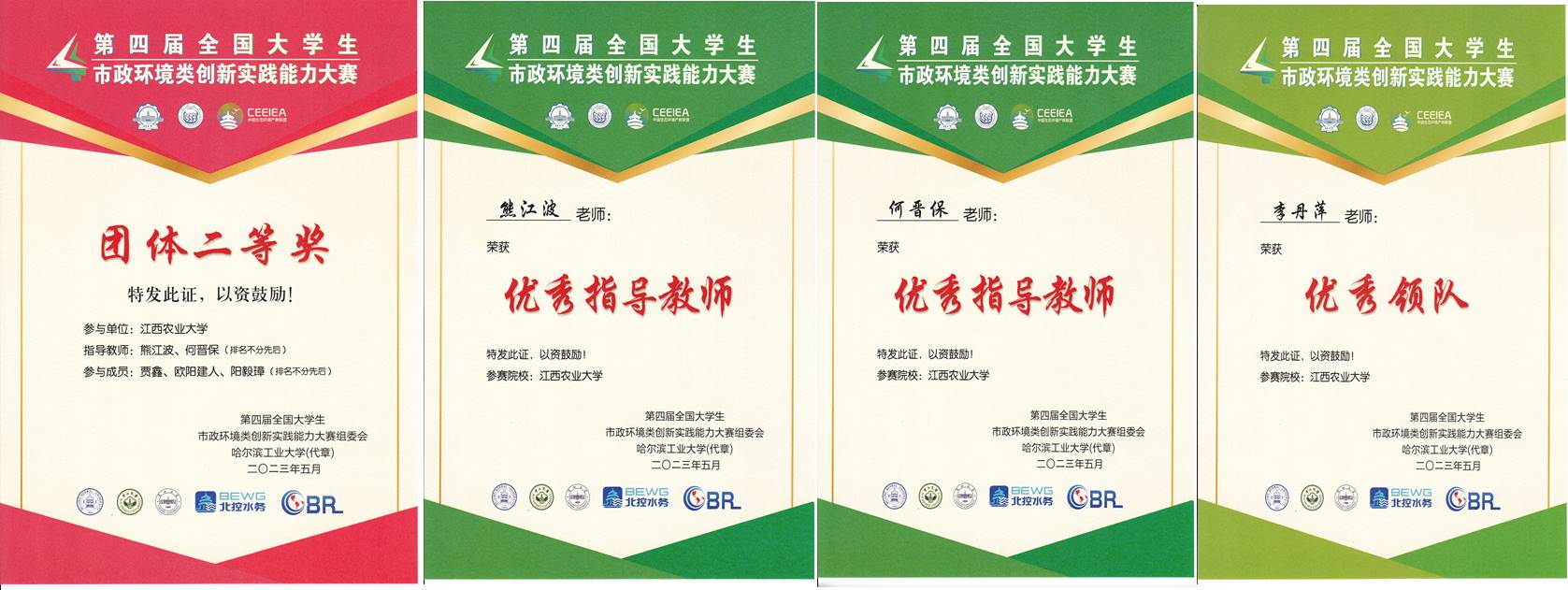 第四届“水务杯”大赛吸引全国147所高校参与,共1423支队伍参与比赛,4269名员工参与竞赛,1135位教师作为指导老师参与。国土院环境科学与工程专业组织了10支队伍,共计30名员工参与比赛。其中由熊江波和何晋保老师指导的贾鑫、欧阳建人、阳毅璋同学闯进决赛,荣获团体二等奖,实现了“水务杯”国赛获奖的历史性突破。同时,熊江波和何晋保老师荣获优秀指导老师,李丹萍老师获优秀领队荣誉。