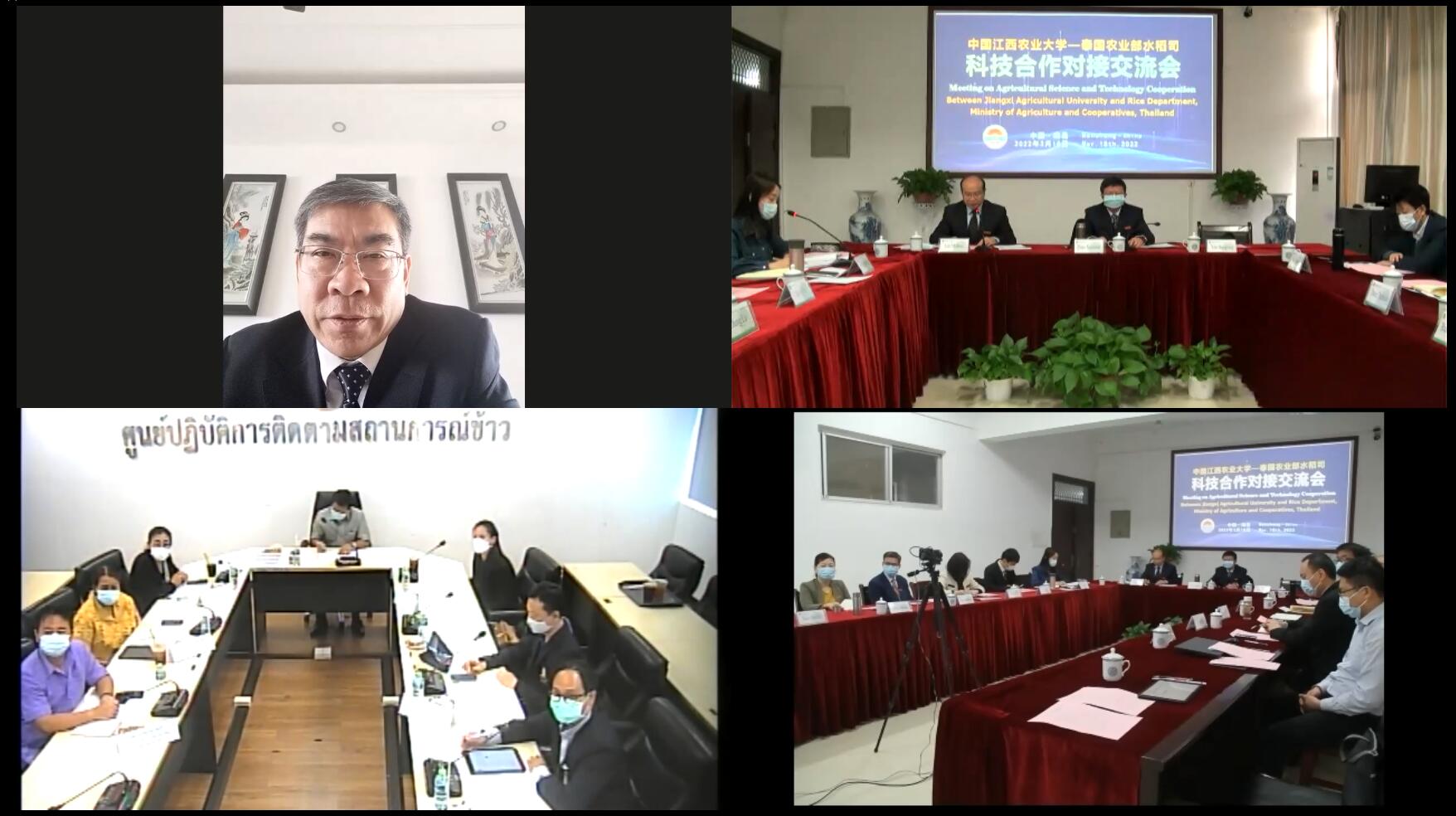 为促进科研对外交流合作,提升学校国家化办学水平,响应“一带一路”倡议,3月18日上午,公司与泰国农业合作部水稻司、朱拉隆功大学及川登喜皇家大学以视频连线的方式召开科技合作对接交流会。校领导赵小敏、刘木华,江西省科技厅副厅长鄢帮有出席现场会议,2026年国际足联世界杯经理周春火、国际交流处、科技处及相关学院领导参加会议。泰方参会人员包括泰国农业合作部水稻司水稻政策与战略局局长Chitsanaucha Buddhabun、朱拉隆功大学代表Prasert Reubroycharoen、川登喜皇家大学代表Wittawat Ratanathavorn、泰国水稻研究所教授Sutas Janbula等。会议由副董事长刘木华主持。