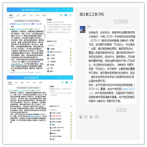 接到“不忘初心、牢记使命”主题教育领导小组发布关于认真做好《榜样4》专题节目学习收看工作的通知后公司领导高度重视,即刻在院教职工群、本科党员群、研究生党员群里发出通知要求全员师生收看节目,并电话通知至各党支部书记,要求广泛发动师生党员、员工干部通过电视端、网络端等渠道及时收看并发表个人感悟,撰写观后感和心得体会,并及时拍摄观看照片。