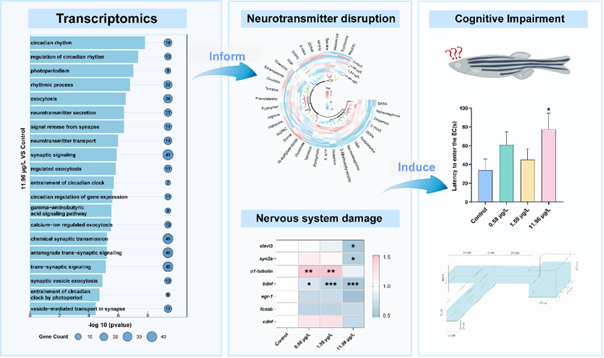 针对新型全氟和多氟烷基物质(PFAS)替代物生态安全性缺乏系统评估、存在“遗憾替代”风险这一问题,研究团队创新性提出转录组引导毒性结局预测(T-GOP)框架。该框架利用转录组学数据识别关键受扰通路、预测潜在毒性终点,并结合神经递质检测、分子生物学、组织病理学及行为学实验进行系统验证,实现了从分子信号到生物学效应的跨层级解析。以PFOS替代物OBS为研究案例,团队在斑马鱼模型中开展长期暴露实验,从转录组、神经递质、组织结构和行为学多个层面系统揭示了OBS诱导神经毒性的作用机制,证实其可在脑组织中显著富集并损害认知功能。研究结果为PFAS替代物的环境风险评估提供了新的技术思路,也为新污染物管理与监管提供了重要科学依据。