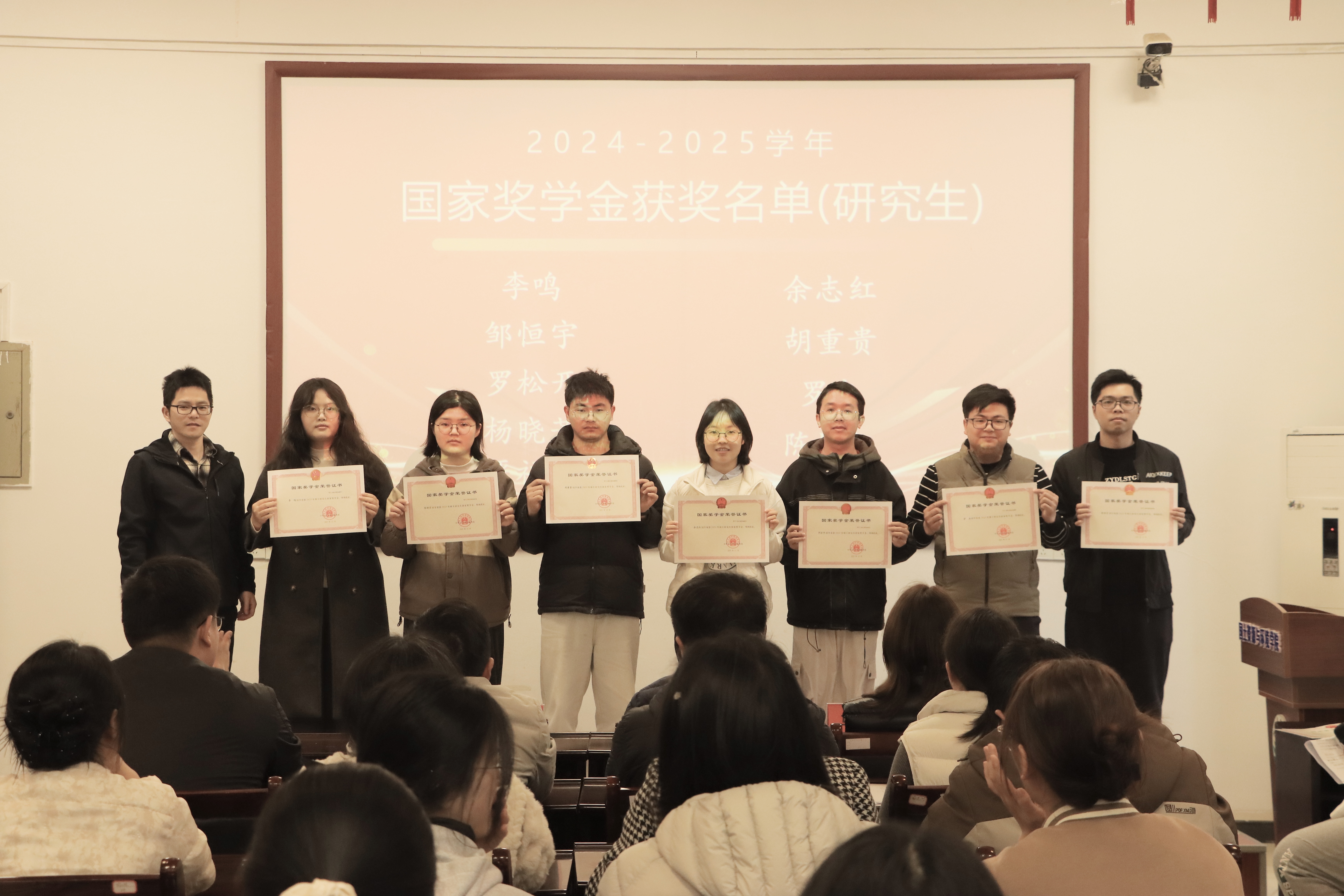 在庄重而热烈的氛围中,颁奖环节有序展开。肖明、涂文清分别为伍语轩、邓嘉悦等4名本科生及李鸣、罗杰等9名研究生颁发国家奖学金荣誉证书。随后,马慧琴及各年级班主任分别为张婷、毛芮妍、曾繁星等48名本科生颁发国家励志奖学金荣誉证书。院领导向全体获奖员工表示热烈祝贺,并勉励他们珍惜荣誉、再接再厉,在今后的学习生活中持续发挥榜样作用,以更优异的成绩回馈社会、报效国家。