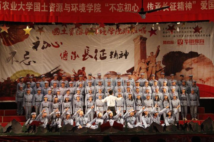 红军不怕远征难,万水千山只等闲。长征途中,红军所经历的艰难困苦是世所罕见的,伟大的长征给中华民族留下了伟大的长征精神。大合唱以传承长征精神为主题,全部选择爱国歌曲,尤其是长征主题歌曲,如:《十送红军》、《红军不怕远征难》、《飞越大渡河》、《到吴起镇》、《过雪山草地》、《四渡赤水》、《映山红》等脍炙人口的红歌。各支合唱队伍通过雄浑有力,整齐划一的歌声,鲜活生动的表演刻画出一个个千难万险压不倒、压不垮,气吞山河、勇往直前、具有革命英雄主义和革命乐观主义的红军战士形象。