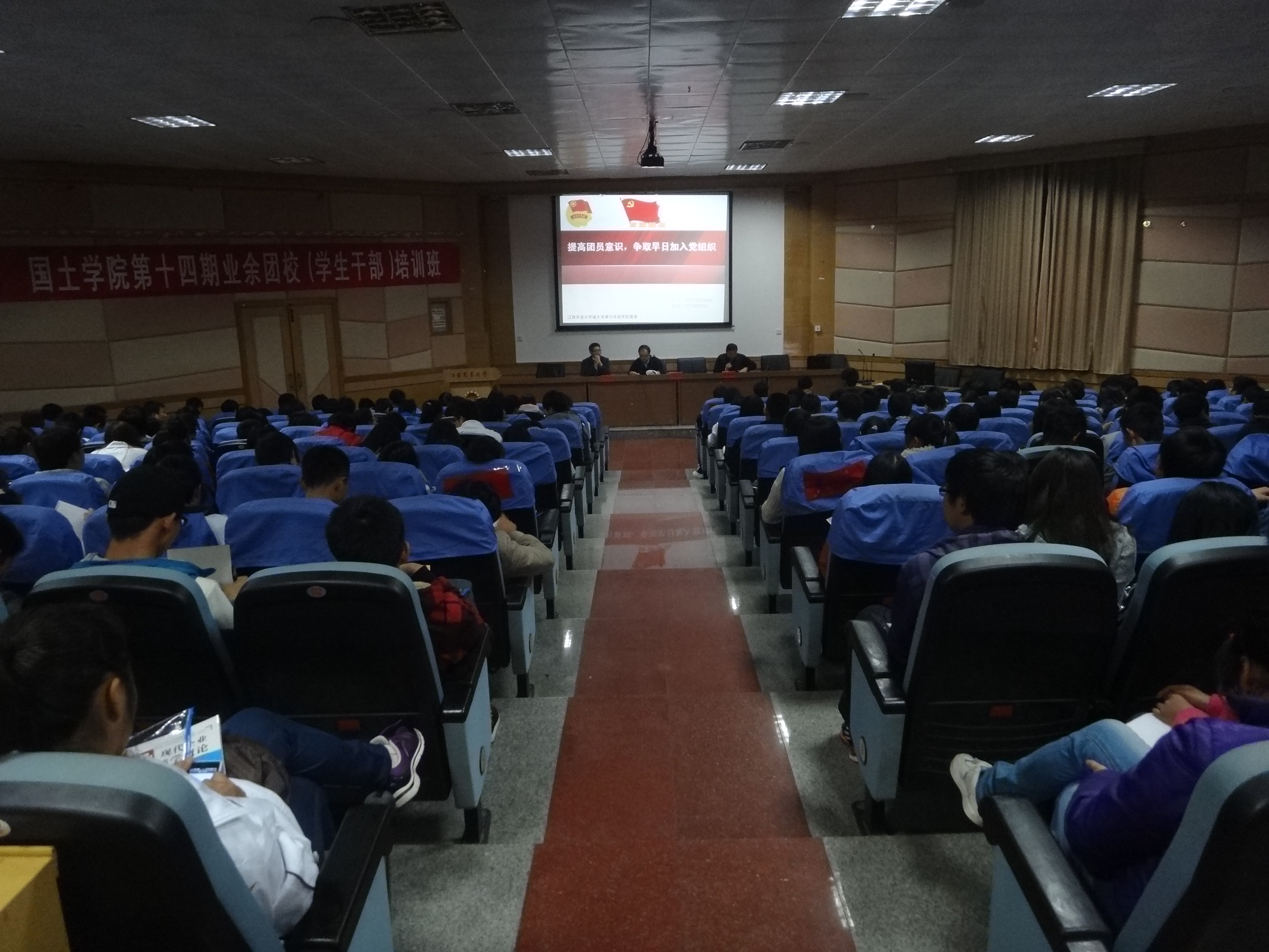 仪式开始,郭细根老师简单介绍了培训期间的培训计划。培训共可分为是理论教学、自由讨论和写学习心得三部分。接着,黄书记介绍了团干培训的重要性及必要性,黄书记还强调课堂纪律一定要保证,并且对团课的进展表达了美好的希冀。之后,黄书记开始了培训的第一讲——《提高团员意识 争取早日加入党组织》,黄书记从团员意识、共青团有关知识、永远跟党走、为树立正确的政治方向和人生目标而努力四个方面为同学们进行讲解,旨在让同学们了解作为一名共青团员所应具备的意识与责任。此次讲座增强了同学们对共青团的了解,明确了团员的责任、权利与义务,为为期一周的培训奠定了良好的基础。继本次讲座之后,还会有三节理论教学课和一节自由讨论课,第二课将由校团委书记胡志坚老师给大家讲授。