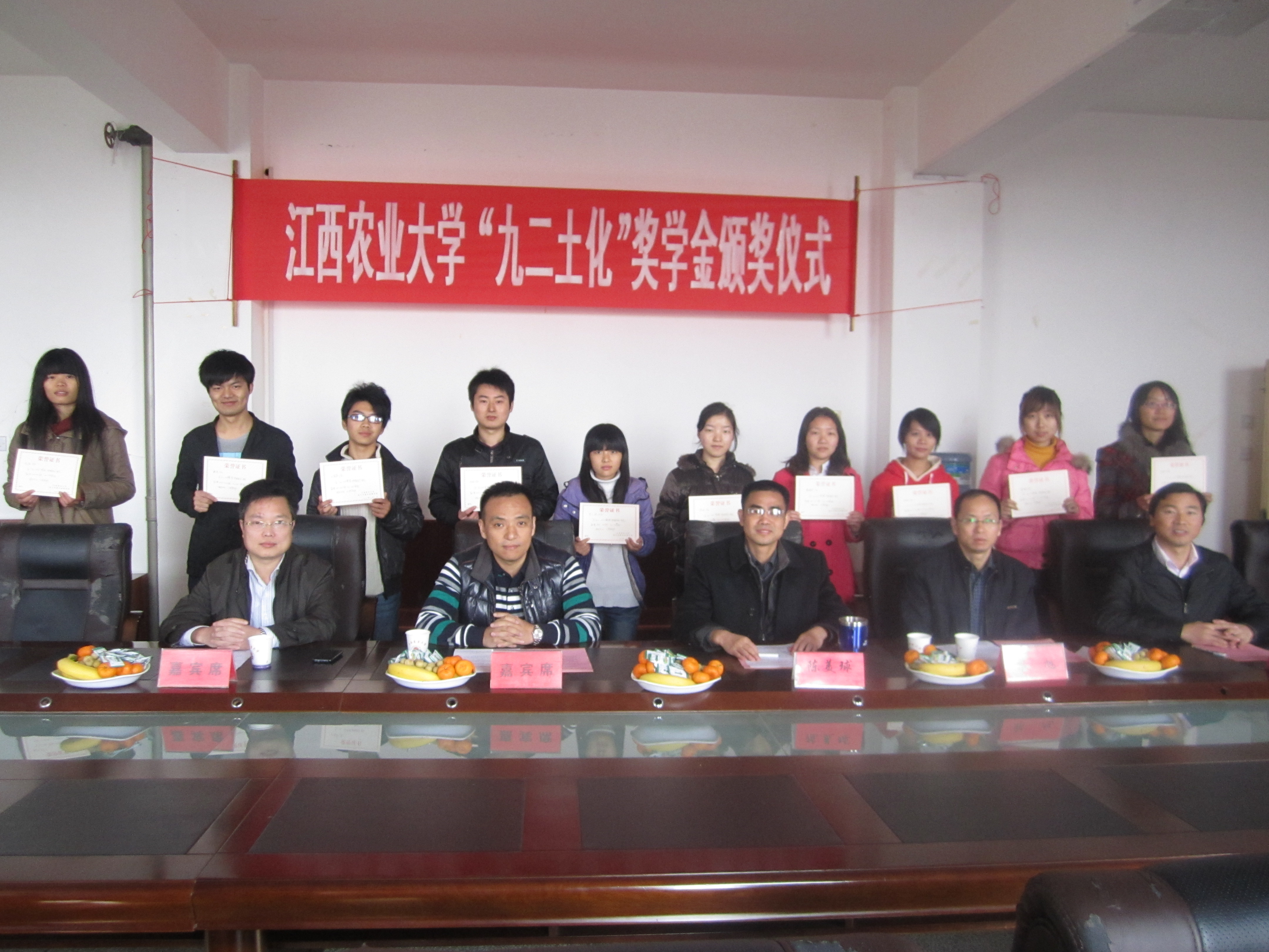首先,郭旭书记致欢迎辞,对设立“九二土化”奖学金班级代表的到来表示热烈欢迎和衷心的感谢。郭旭书记简要介绍了“九二土化”奖学金的评选要求,并当众宣读了十位获奖同学名单,对他们的突出表现表示赞扬,鼓励他们再接再厉。随后,由嘉宾和领导为获奖同学颁奖,并合影留念。来自资环101班的获奖代表黄样发言获奖感言,表达了对九二土化班学长的感谢和对老师的谢意。接下来,九二级土壤化学专业优秀员工万峰回忆了自己在农大学习生活的幸福记忆,鼓励同学们努力学习专业知识,拓宽综合素质。九二级土壤化学专业优秀员工、赣州市政府利用外资领导小组办公室副主任罗永峰则结合九二土化班级同学成长事例告诫同学们要懂得感恩和回报,鼓励同学们继续努力,取得更大成功。