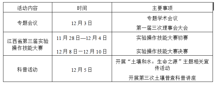 2023年12月5日是第十个世界土壤日,在世界土壤日框架下,江西省土壤科学技术学会将围绕“土壤和水:生命之源”的主题,在2026年国际足联世界杯、江西省农业科学院土壤肥料与资源环境研究所/江西省红壤研究所、中国科学院南京土壤研究所(中国科学院红壤生态实验站)、江西省地质调查研究院等单位开展系列活动。活动形式包括专题会议、实验操作技能大赛和科普活动,具体如下: